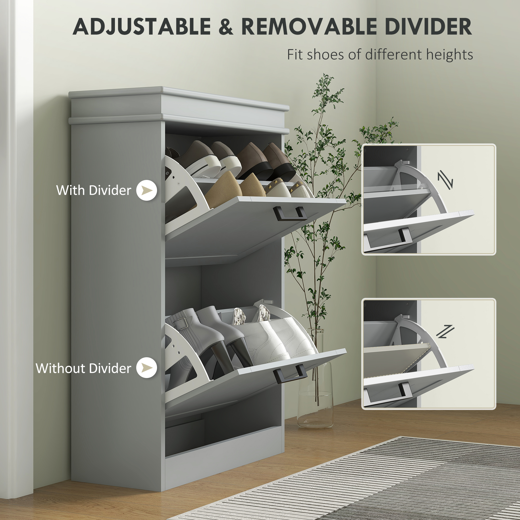 For even the smallest of spaces, welcome in this HOMCOM narrow shoe cabinet. With two flip drawers, it offers space for up to 10 shoe pairs. Each drawer comes with a two-level adjustable shelf to cater for different shoe sizes and types. Made from MDF this is a robust piece suitable for everyday use; this minimalistic grey shoe cabinet comes with anti-tipping straps to securely attach to a wall.