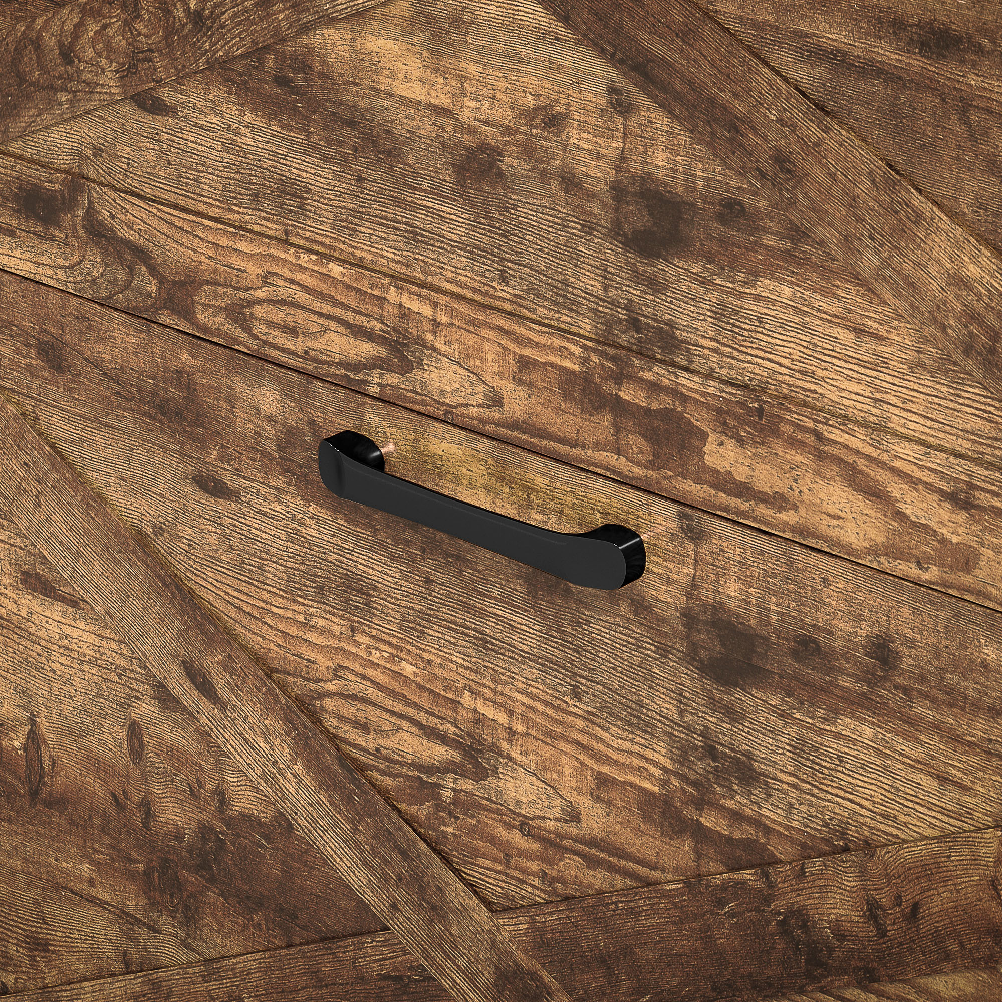 - X-shaped barn doors on wood grain finish bring rustic farmhouse charm