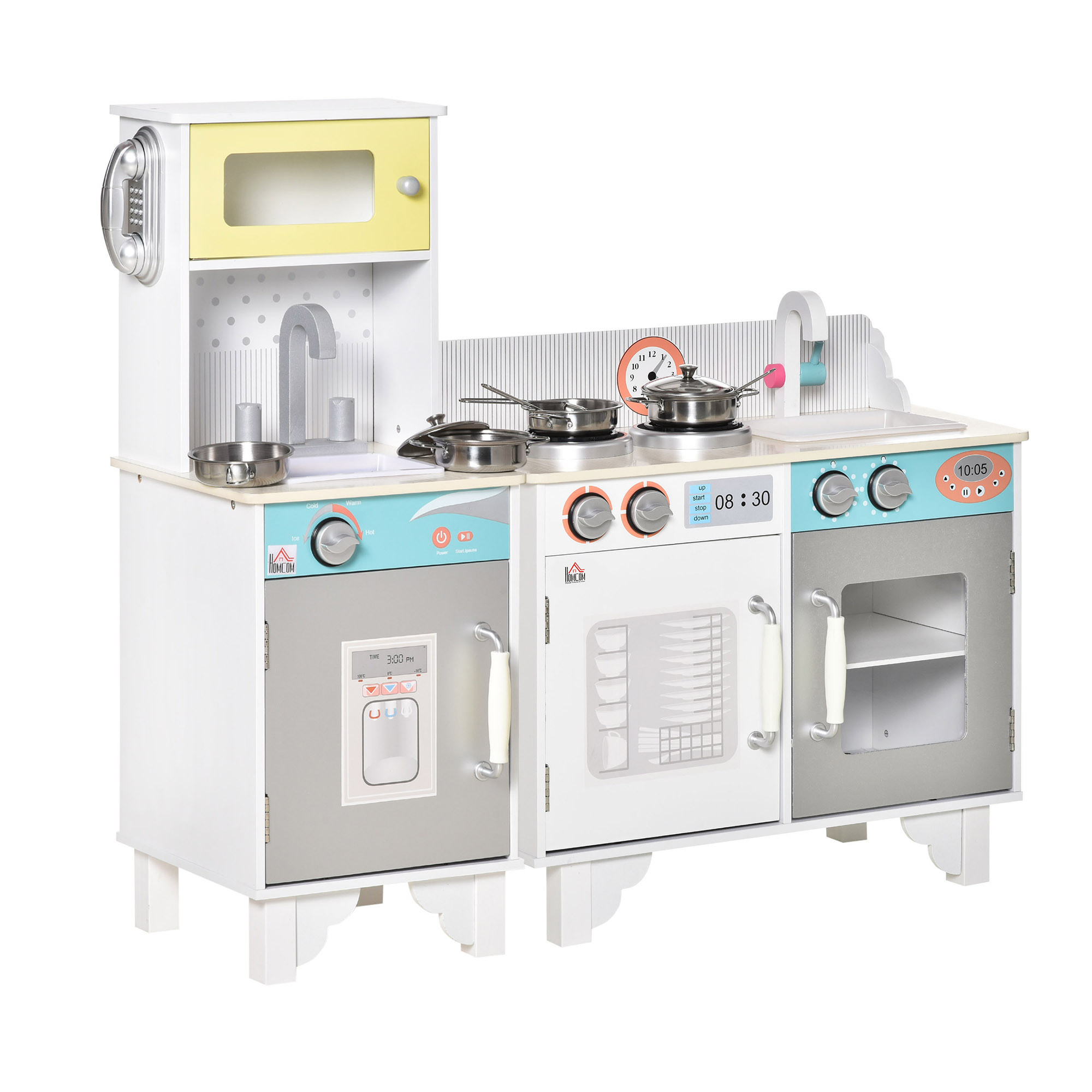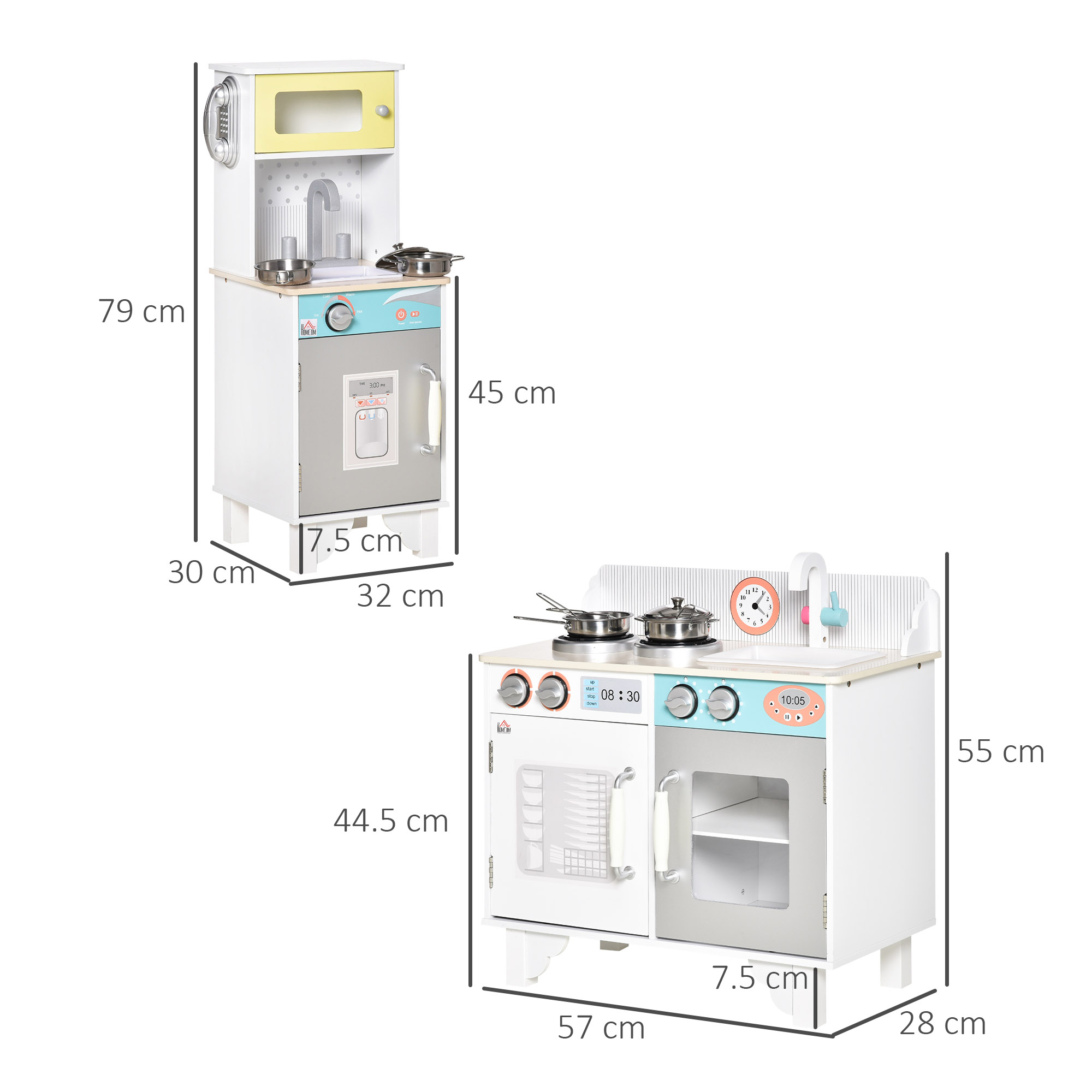 Playtime just got a lot better, thanks to 2 sets kids kitchen play toy from HOMCOM. Imagination can run wild as they use the sink, cooking bench, stainless pots and more. Turn the faucet and temperature dials to get their make-believe cooking underway. When playtime's over, store the accessories in the cabinets or storage basket, keeping your room tidy. Don't worry about getting the set messy, which is made from MDF, it's easy to clean.