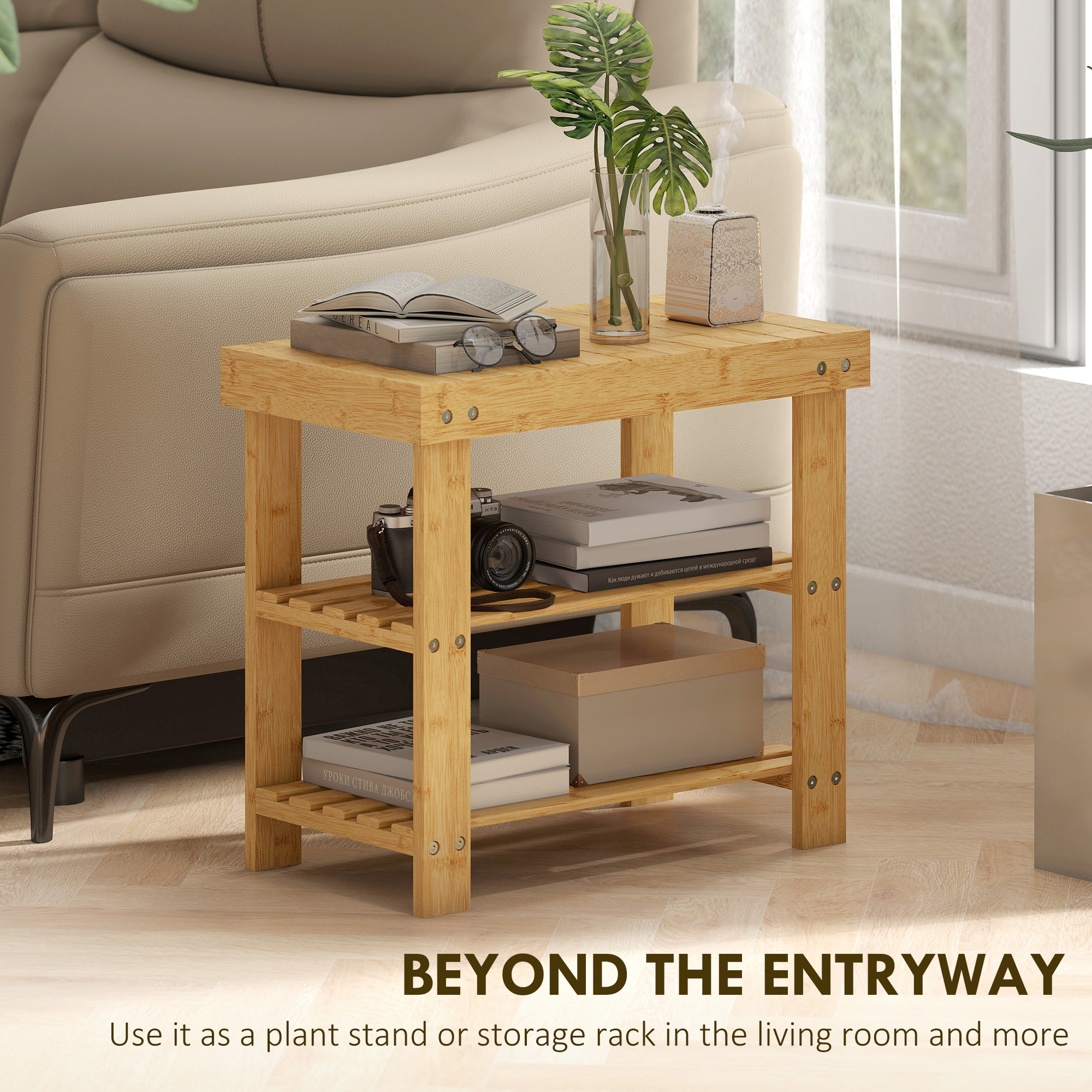 The beautiful way to hold footwear and give you a place to change - this HOMCOM small shoe bench. It's made from bamboo for a strong and beautiful structure - leave it how it is, or customise to your liking. With two slatted shelves there's room for four footwear pairs - be it shoes, boots, heels or trainers. And thanks to the flat top, you also have a place to sit.