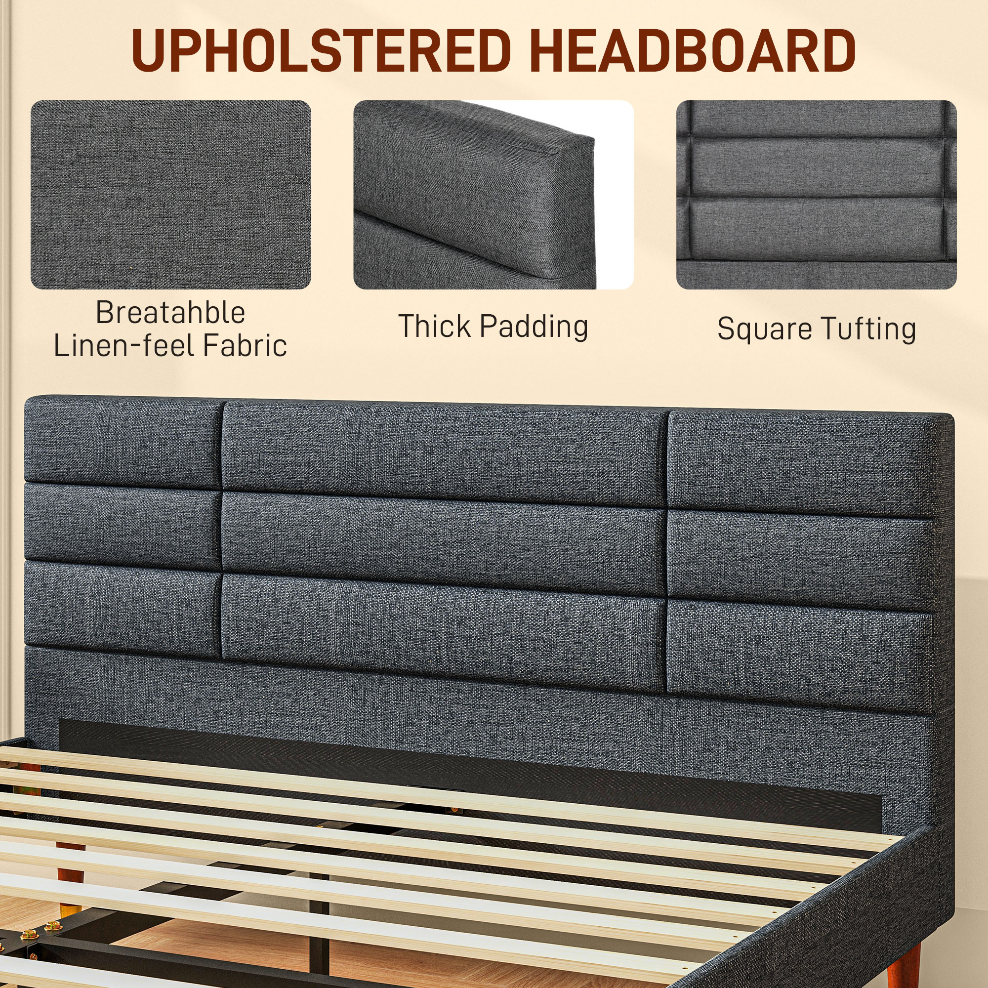 A soft touch to dream times with this HOMCOM upholstered king bed frame. Look to the fabric sides for a welcoming look, with the padded board allowing you to lean back comfortably - perfect for reading a book in the evening or on the weekends. It comes with wooden slats to support and hold the mattress in place; look to 19cm under-bed clearance for handy and discreet storage space.
