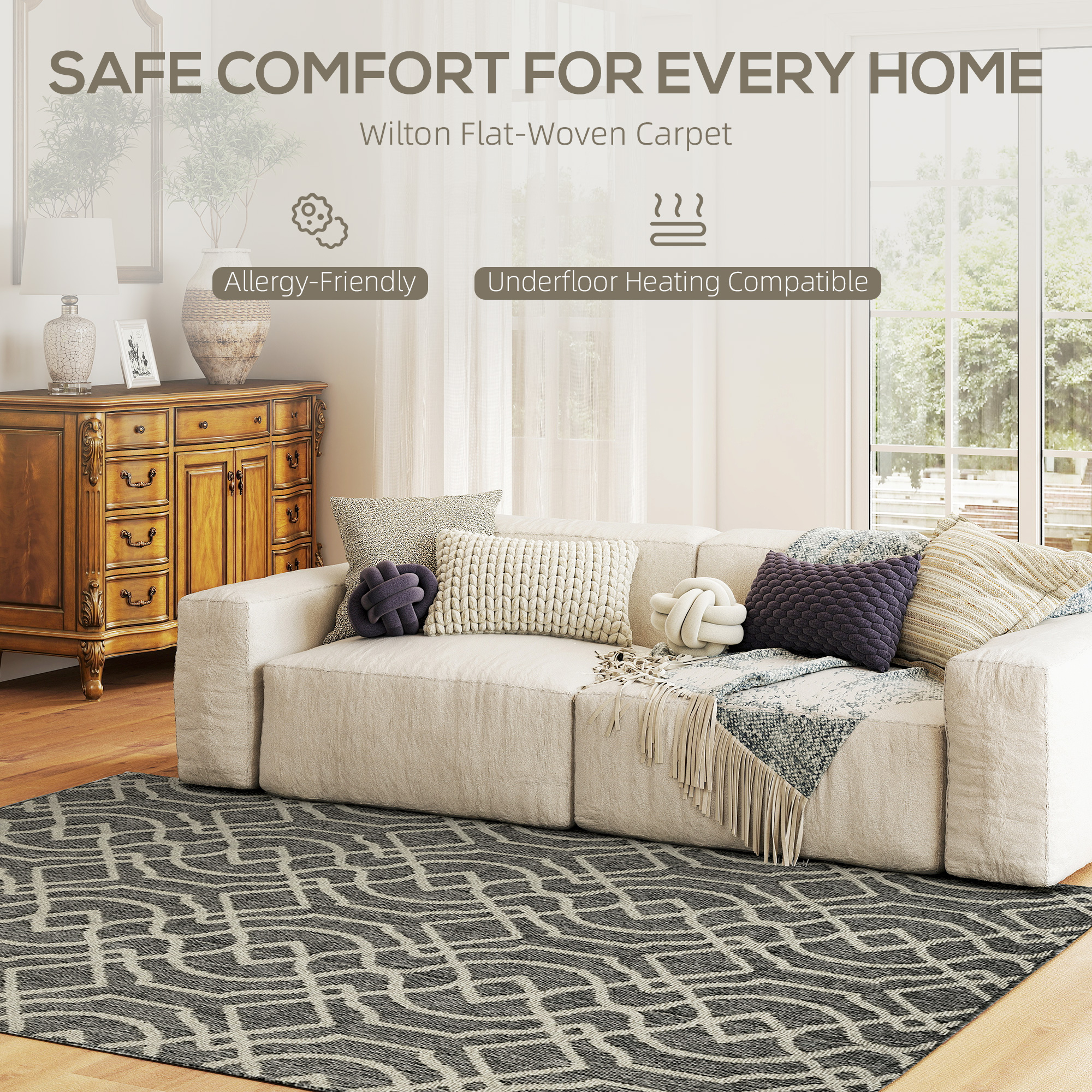 Give your home a fresh, modern feel with the HOMCOM Wilton flat-woven garden rug, designed with charming geometric patterns. Made from polypropylene, it's great for allergy sufferers and works well with underfloor heating. Whether indoors or out, the washable rug is a practical choice—UV resistant and easy to clean with a quick wipe or machine wash.