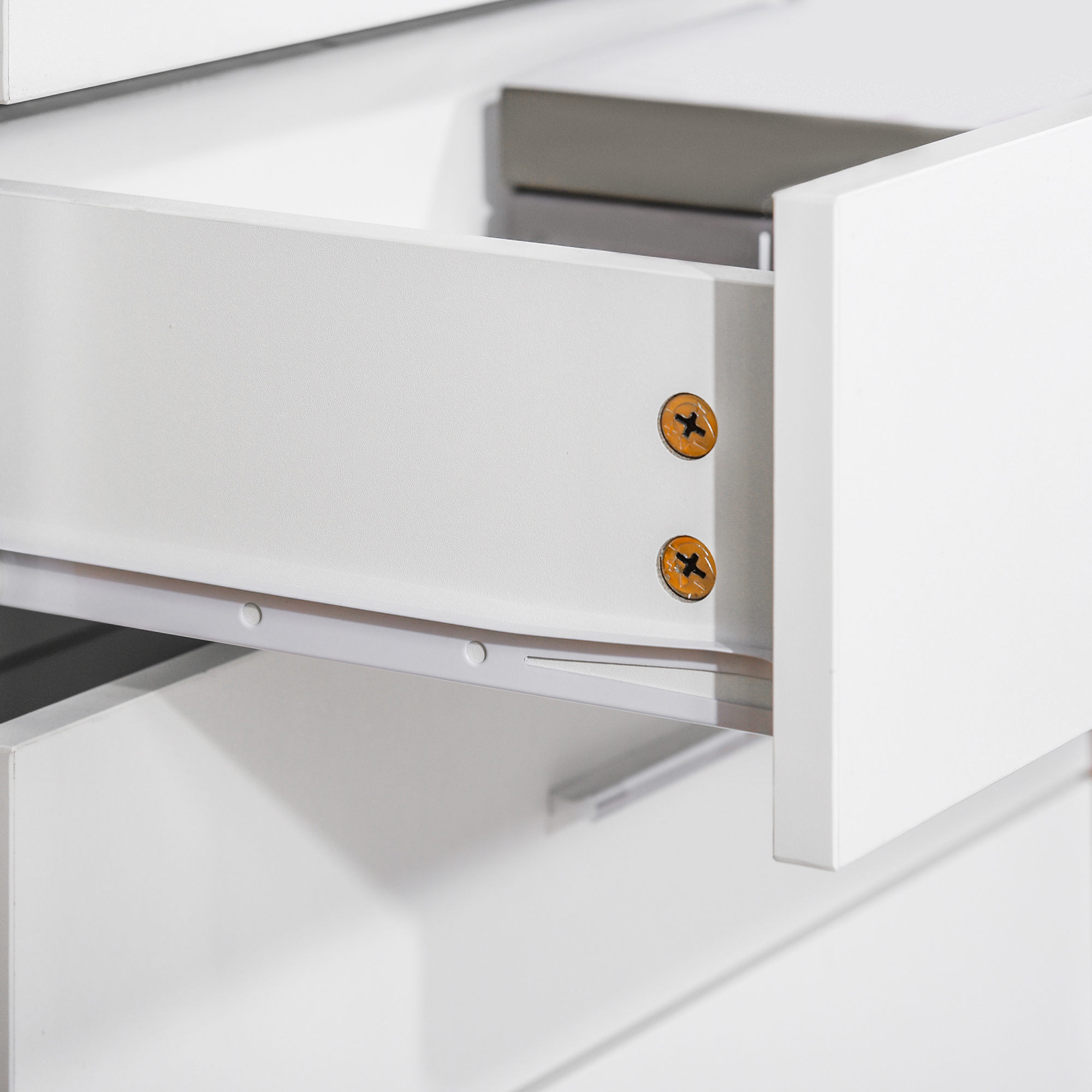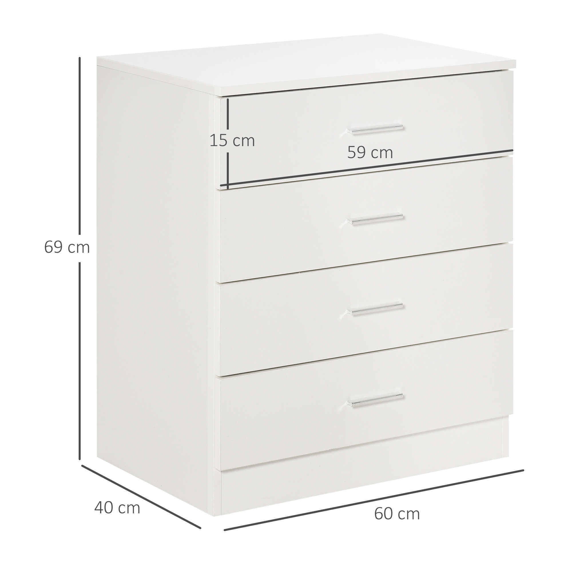 Simplicity is sophistication with this HOMCOM chest of drawers bedroom. A clean white colour, paired with the classic boxy shape and touch of silver-tone - thanks to the aluminium handles - means the tallboy chest of drawers is welcome anywhere you want it to be. Formed of four drawers: plenty of space to keep home tidy, such as clothes, books and more. Metal gliding rail inside each drawer for smooth opening and closing. Finished with a slightly thick base for elevation and steadiness.