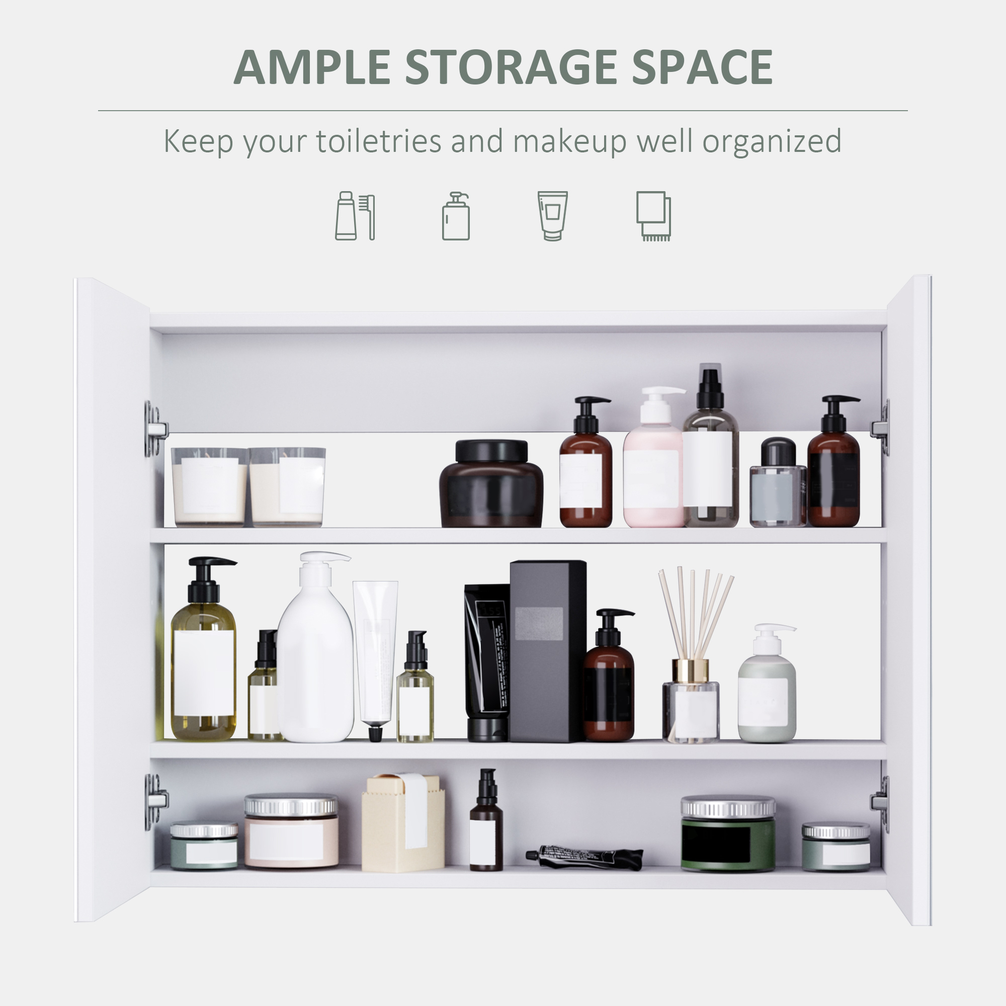 Modern and noble design distinguishes this wall cabinet bathroom mirror from conventional cabinets and will give your bathroom new ambiance. With three inner shelf, including a three-level adjustable shelf, also many wash ware tools can be stored in the cabinet. The cushioned hinges make the door open and close without noise. Don't wait, click and get a modern and usable wall cabinet mirror now!