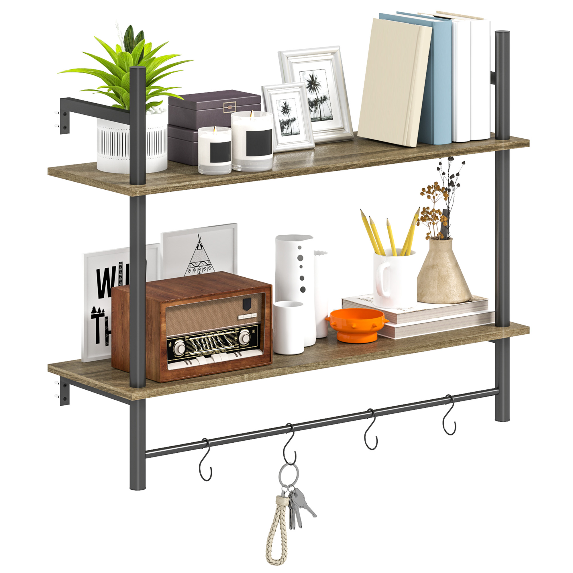 Transform your walls into a stylish and practical display with HOMCOM hanging shelf. The two-tier wall shelves, paired with four snazzy S-shaped hooks, cater to all your storage needs. The chic melamine finish ensures easy cleaning, while the stable build with guardrails adds a layer of safety. Maximise space effortlessly with this sleek wall shelf unit!