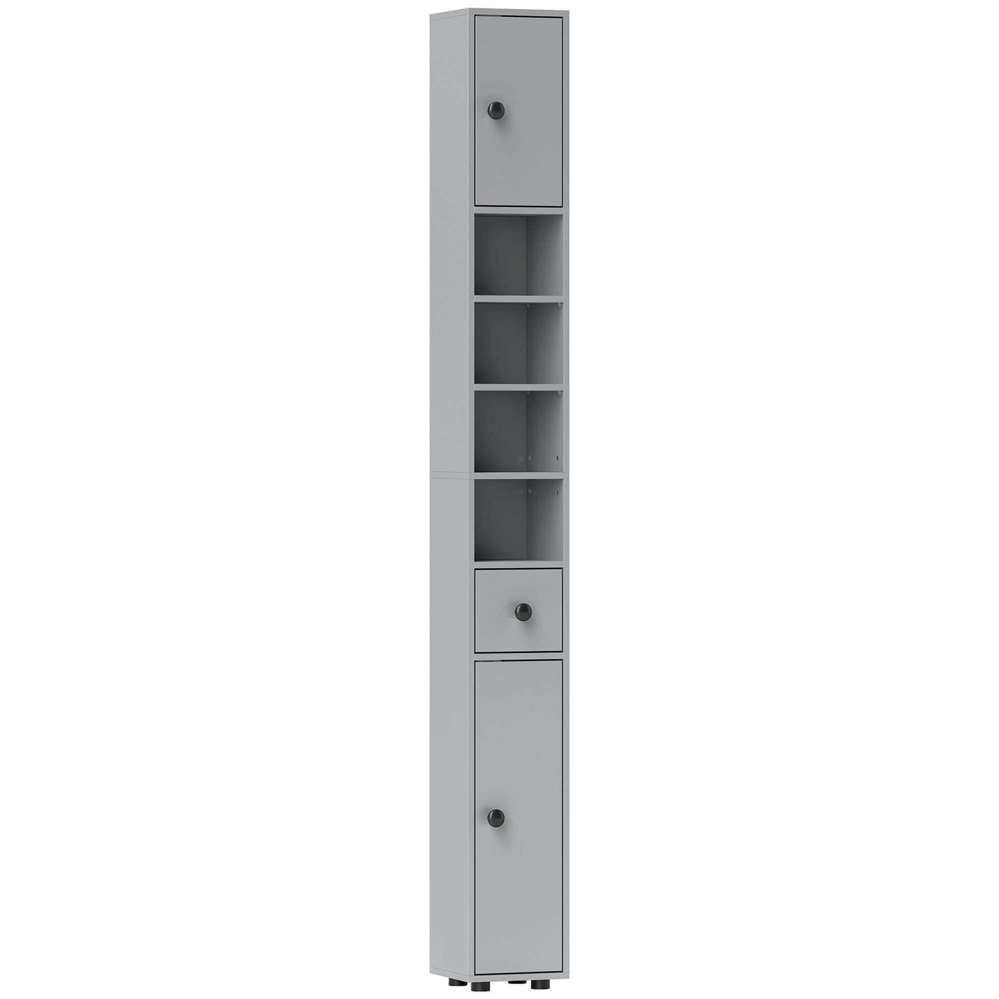 Small bathrooms are always in need of efficient storage. With this kleankin cabinet, you get exactly that. The 180 x 20 cm size makes it a tall, narrow piece; featuring a top and bottom cupboard, drawer and four open shelves, it provides plenty of storage for bathroom essentials. The particle board structure is solid, with a melamine coating for light protection against everyday wear. The clean grey design gives it a modern, versatile look.
