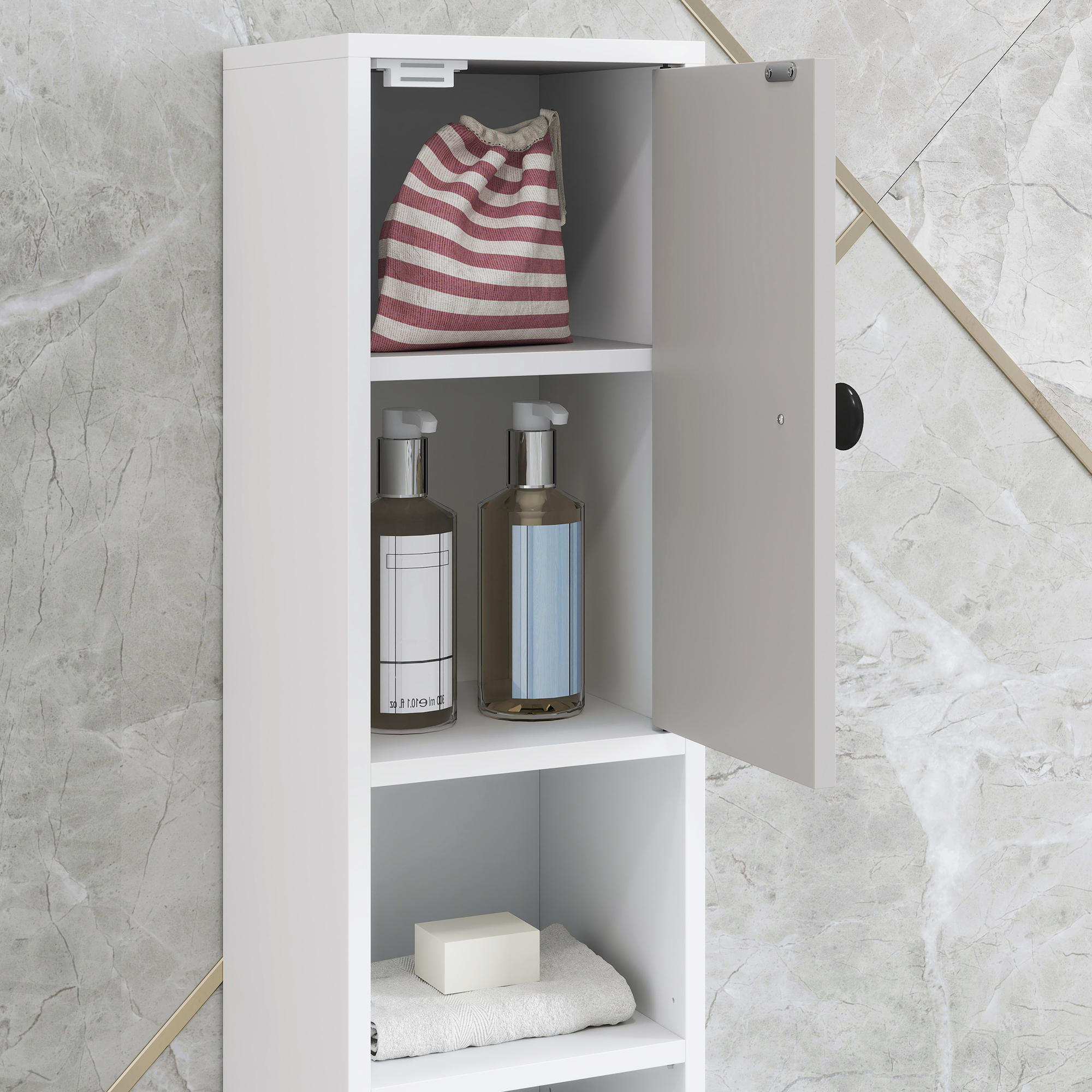 Small bathrooms are always in need of efficient storage. With this kleankin cabinet, you get exactly that. The 180 x 20 cm size makes it a tall, narrow piece; featuring a top and bottom cupboard, drawer and four open shelves, it provides plenty of storage for bathroom essentials. The particle board structure is solid, with a melamine coating for light protection against everyday wear. The clean light grey design gives it a modern, versatile look.
