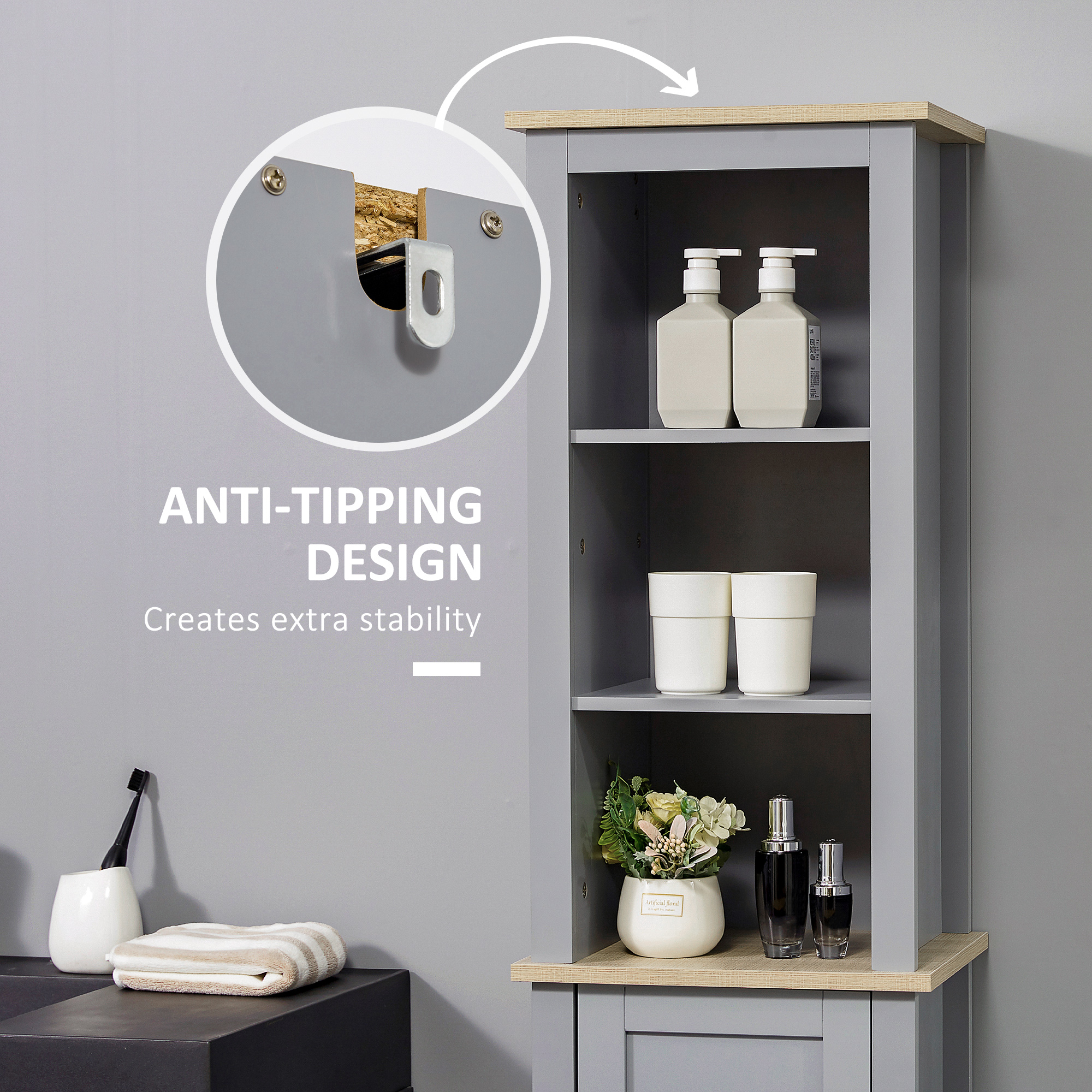 Bathroom storage doesn't always have to be clean and contemporary. If you're looking for something a little different - go for this narrow freestanding cabinet from kleankin. A slightly boxy shape pairs with the mid-grey tone and the contrasts with the wood-effect panels for some retro rustic charm. It is formed of a bottom cupboard and three upper shelves for decent amount of open and discreet storage. It's made from MDF, so it's durable.