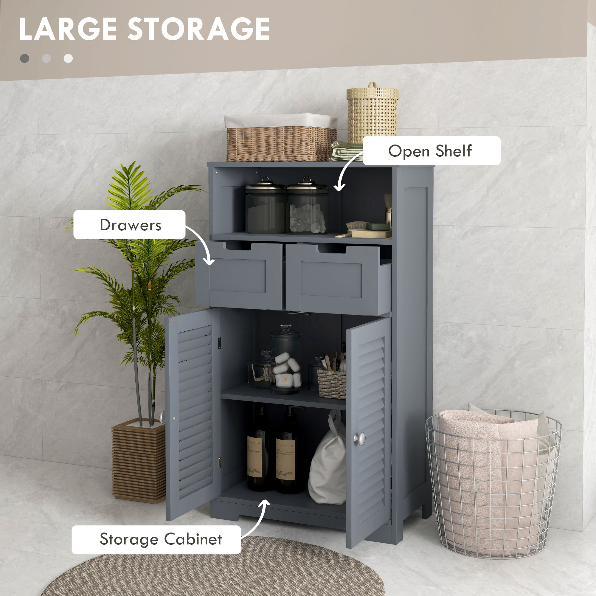 This kleankin small bathroom cabinet gives you that extra storage you need, wherever you need. Combines an open shelf, drawers and bottom cupboard - plenty of space. It's made from MDF: sturdy and suitable for everyday use. Comes with anti-tipping straps to attach safely to a wall.