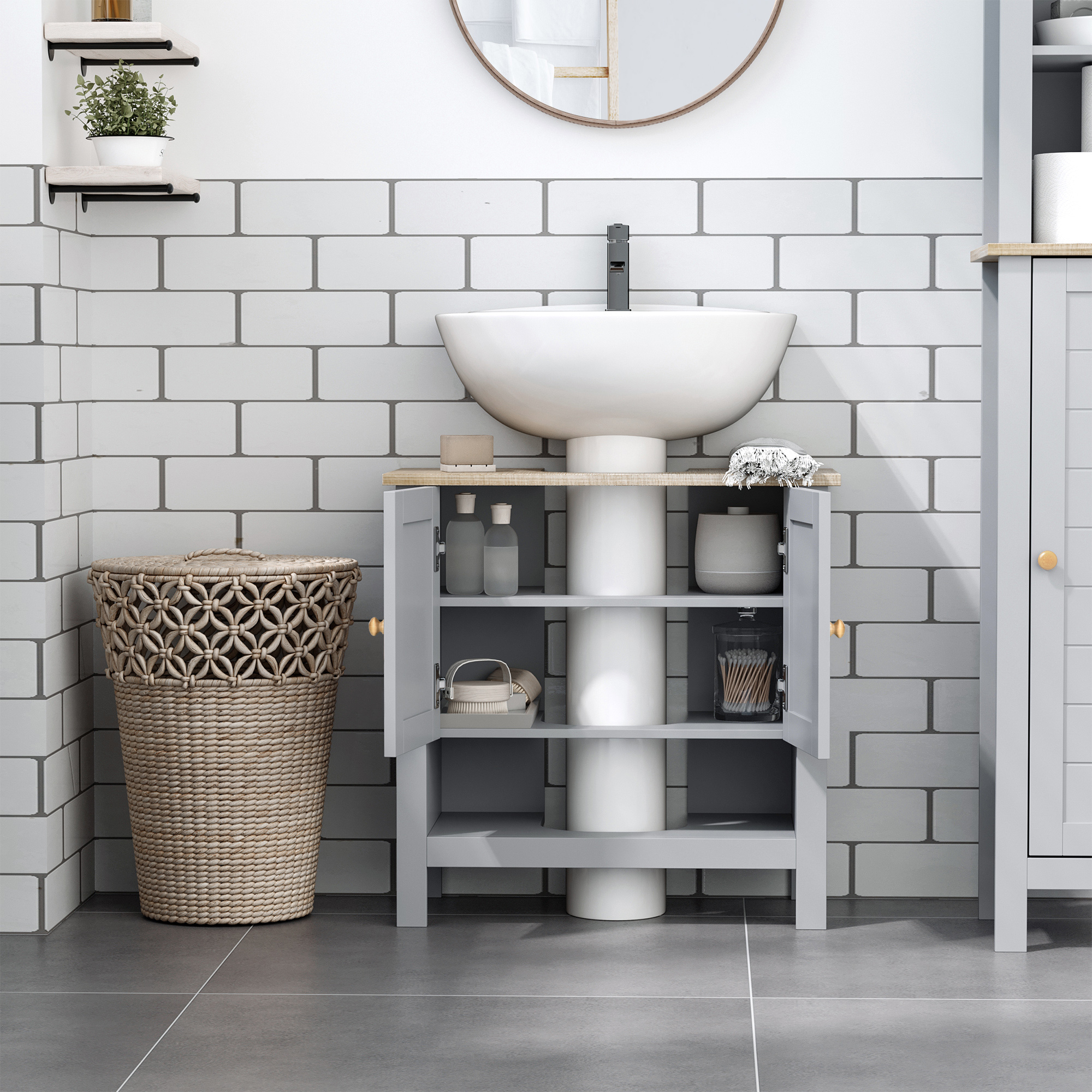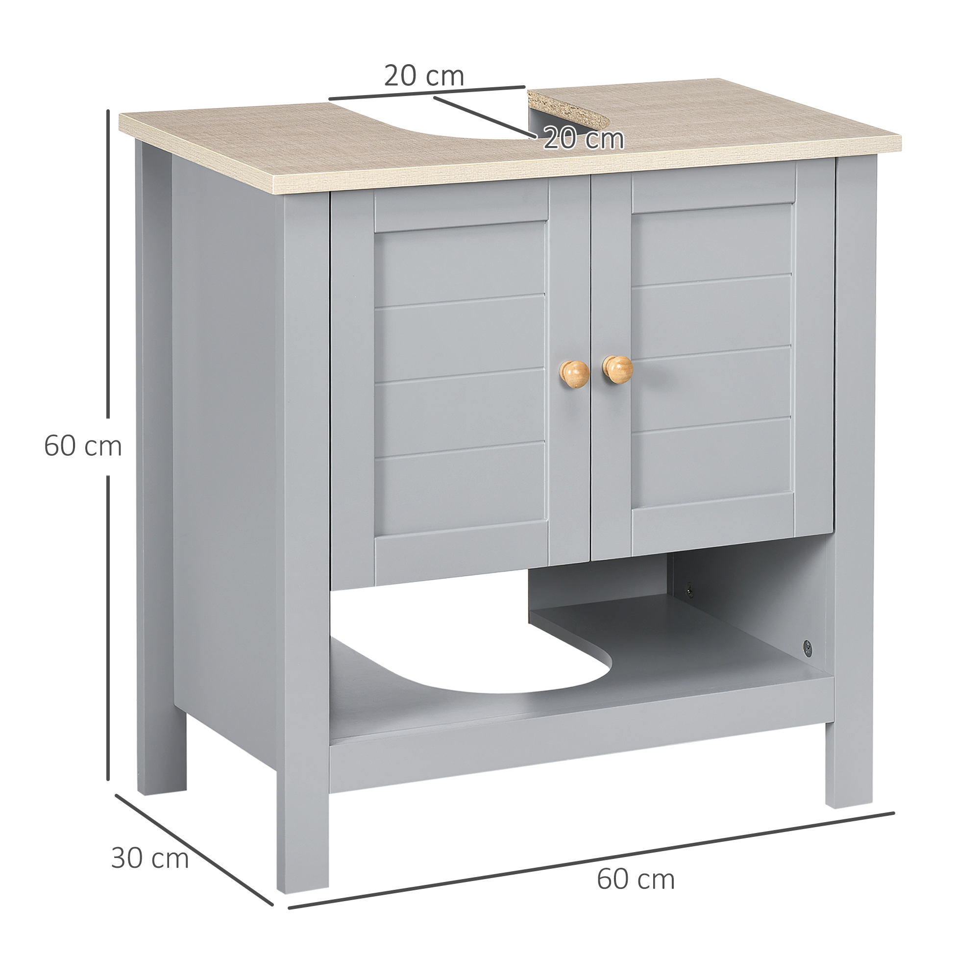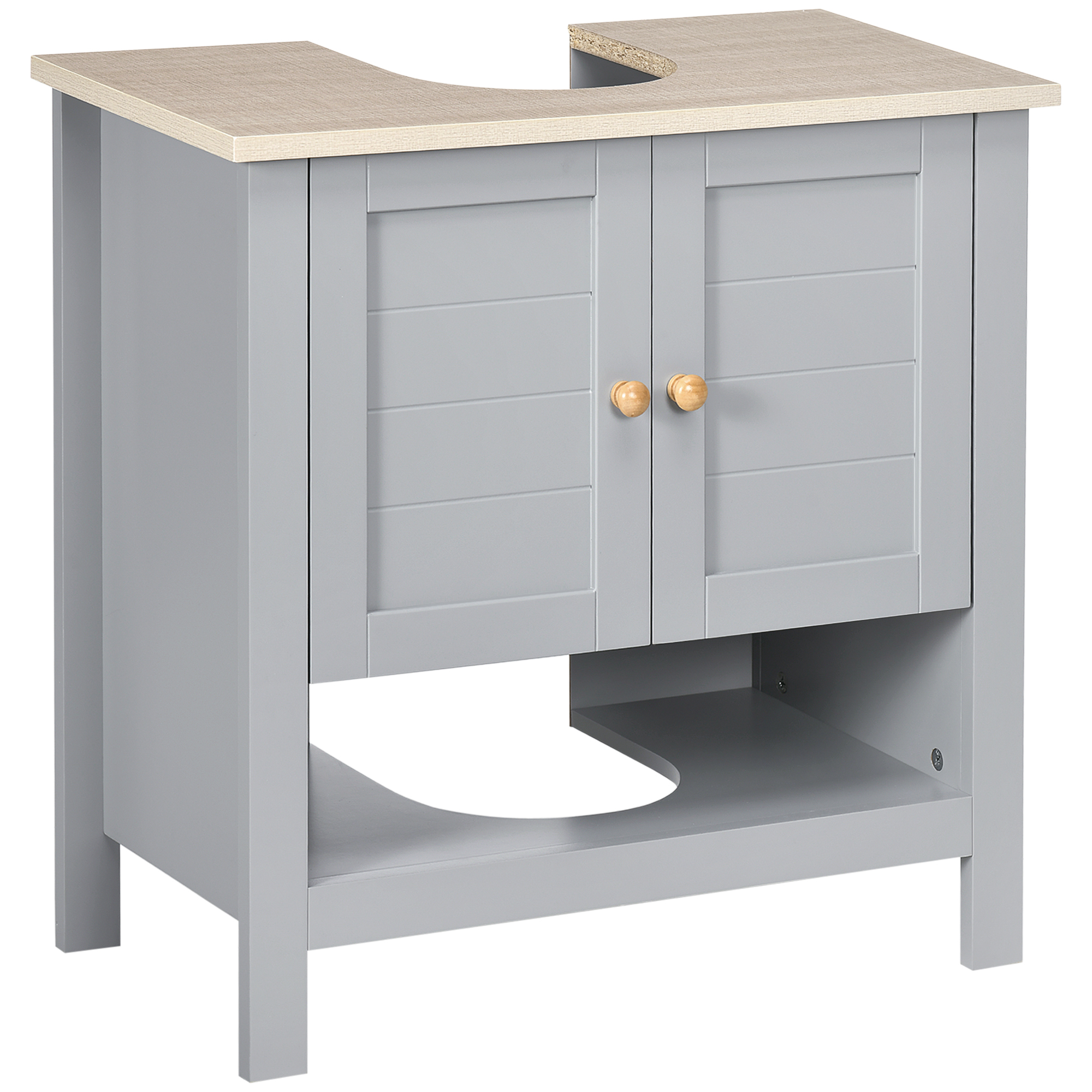 Expand under-sink storage with a touch of homely rustic charm - bring this under-sink cabinet from kleankin into your bathroom. The grey colour and boxy shape creates a stand-out look which also welcomes itself into the space with ease. The bathroom cabinet is made from MDF for durability, featuring a top cupboard and shelf for plenty of storage space. Finished with a 'U' cut out, allowing the under sink bathroom cabinet to slot in snugly around the sink and pipes.