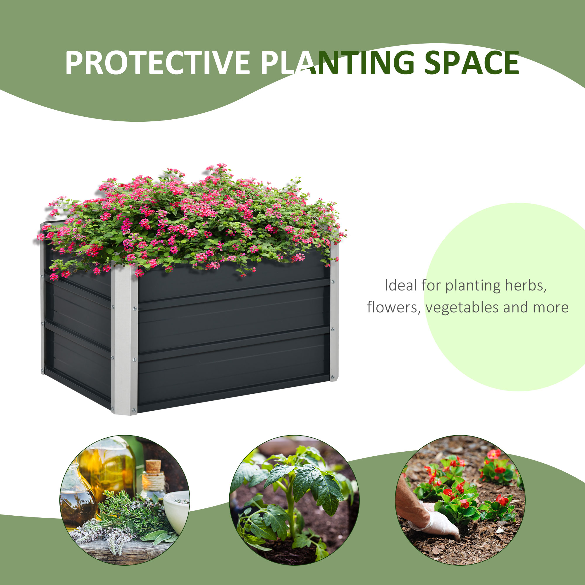 Raised garden beds are the better way to grow plants and vegetables at home. Owing to the simple structure and the quick guide, you can build up this ''garden castle''. Our Outsunny herb garden makes it easy to start your own planting. The garden box easily keeps weeds away from your soil, prevents soil compaction, provides good drainage, and acts as a defense against submergence, small animals, and other undesirable factors. A great practical and decorative addition to your patio.