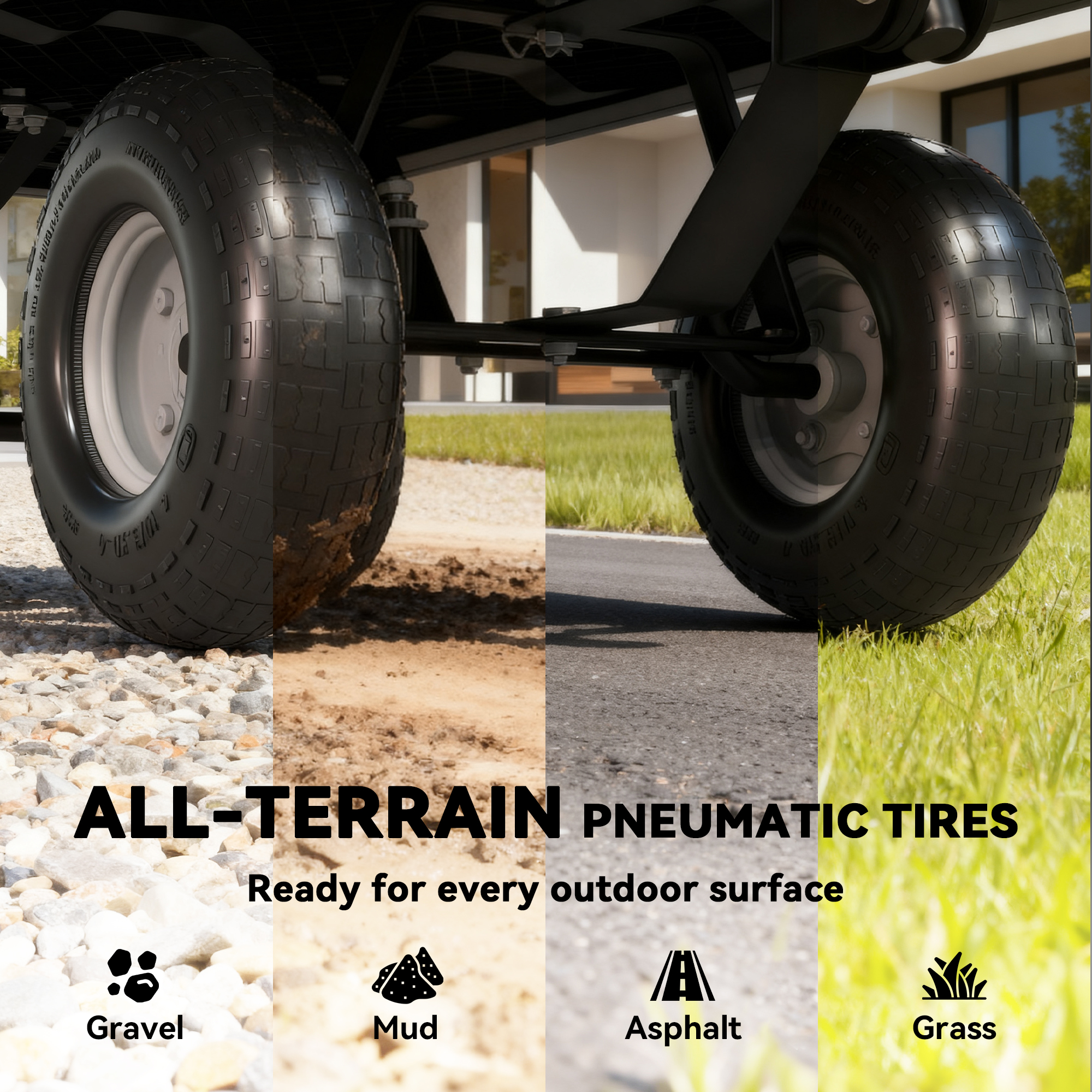 - 25cm pneumatic rubber tyres for smooth rolling and shock absorption
