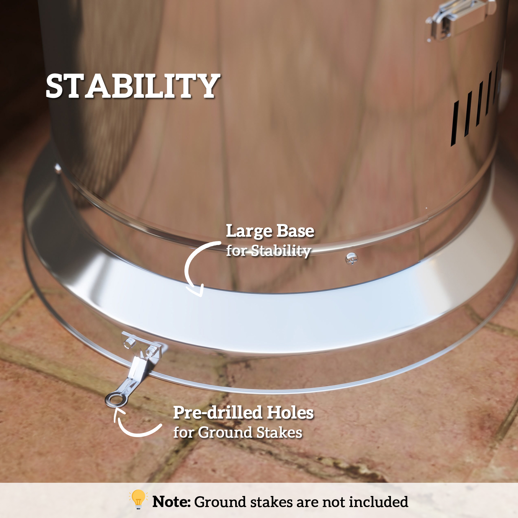 - Large base keeps it steady and balanced, pre-drilled holes to insert ground stakes to pin to ground