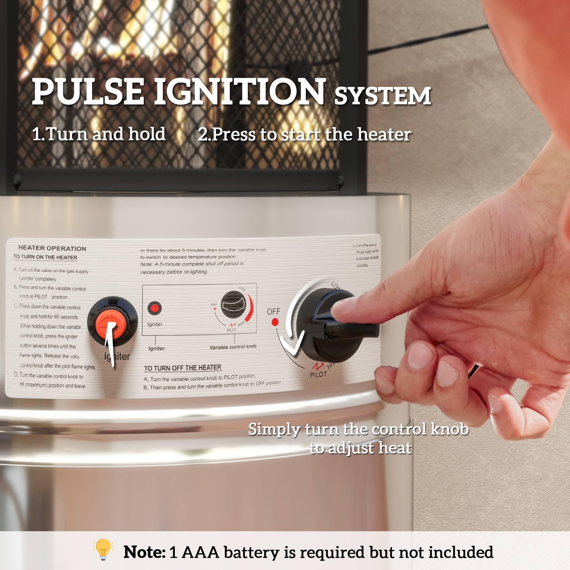 - 37000 BTU gas heater warms up 1.5 m areas, with bottom tank room. Pulse ignition for easy lighting