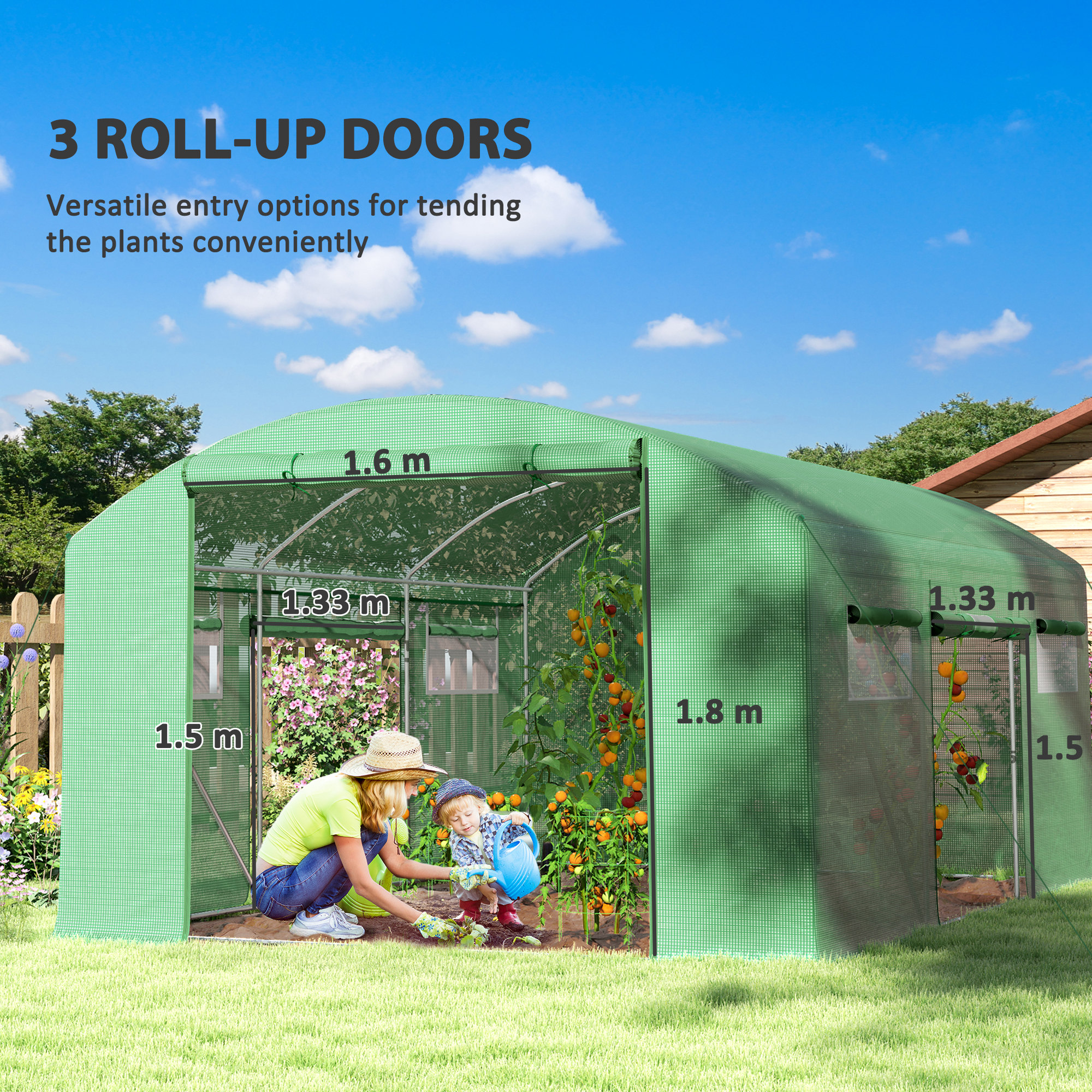 Year-round gardening with plenty of space and protection, with this Outsunny polytunnel greenhouse. Three roll-up doors and multiple mesh windows allow easy access and plenty of fresh air. Fitted with a 140gsm plastic cover for a protective shell - shields inside fromlight weather and allows sunlight to pass through for beautiful growth. Complete with four ground stakes and four guy ropes in the package to pin greenhouse to the ground.