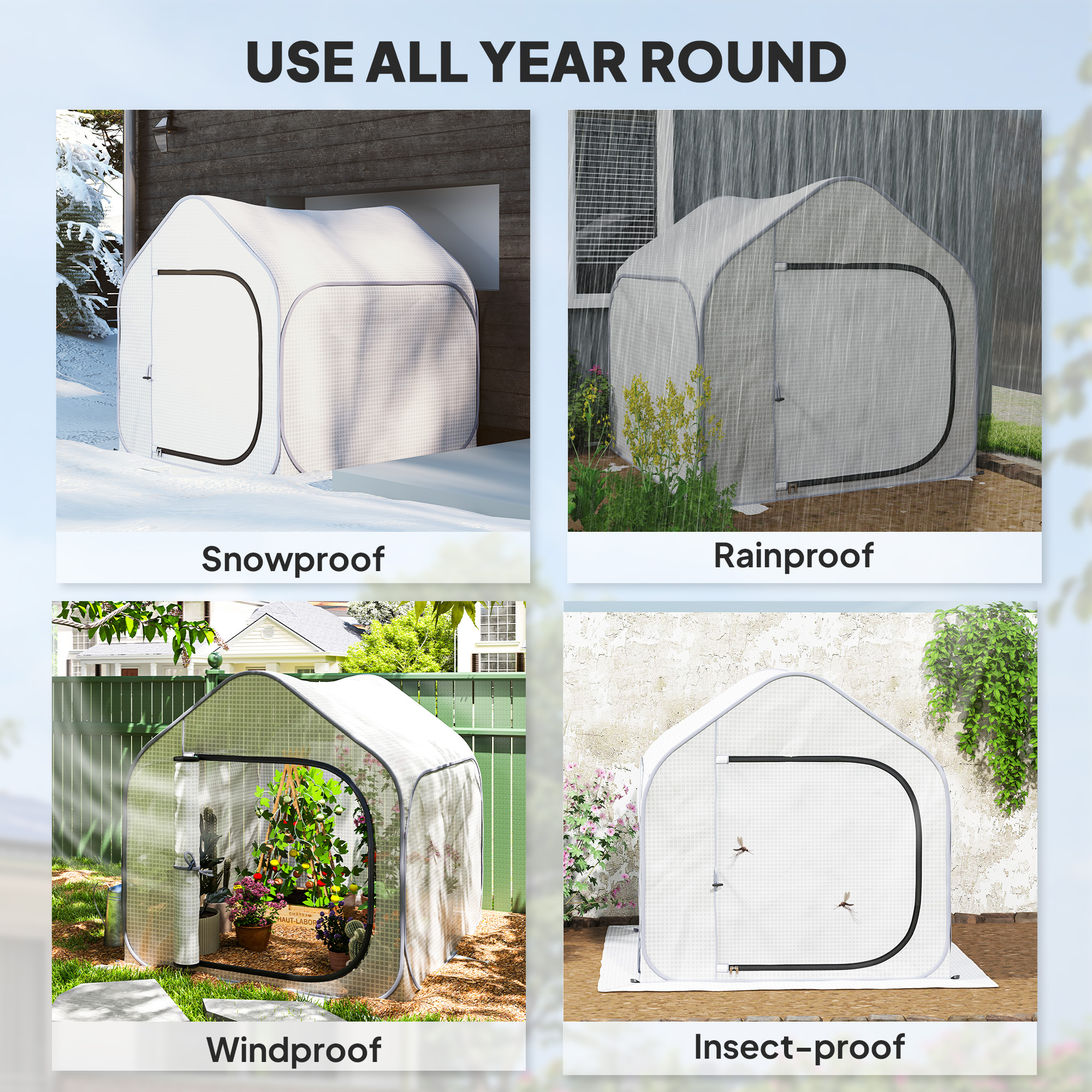 No matter the space, you can grow plants, flowers or small vegetables with this Outsunny pop-up greenhouse! A mini 150 x 148cm size, it is portable and foldable: bring out and store away easily, whenever. Fitted with a 140g/m² plastic cover, keeping inside shielded from rain and wind, whilst letting nourishing sunlight through - encouraging all the growth as possible. The growing possibilities are endless...