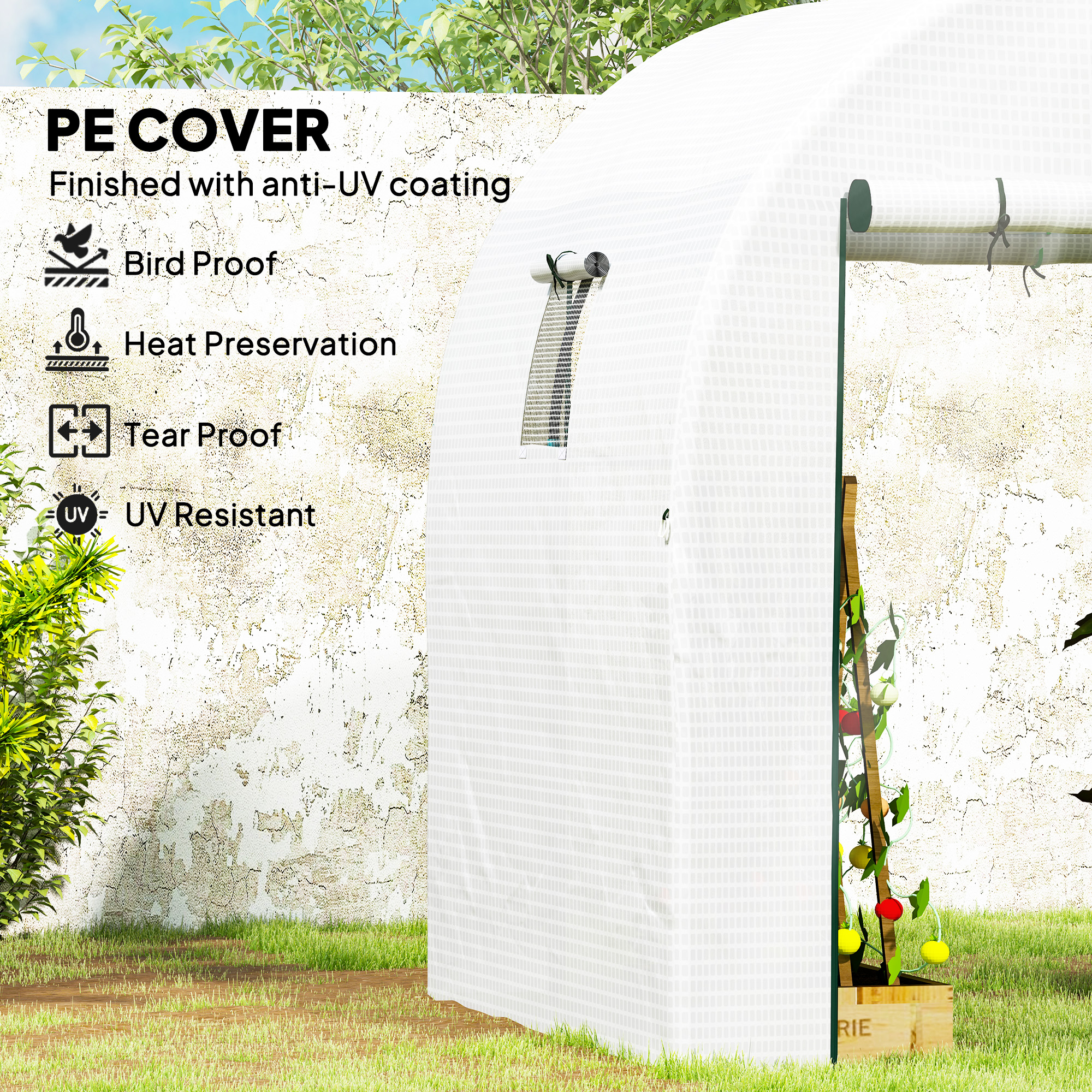 - Extended cover edges to bury into soil. Ground stakes and guy ropes for extra stability