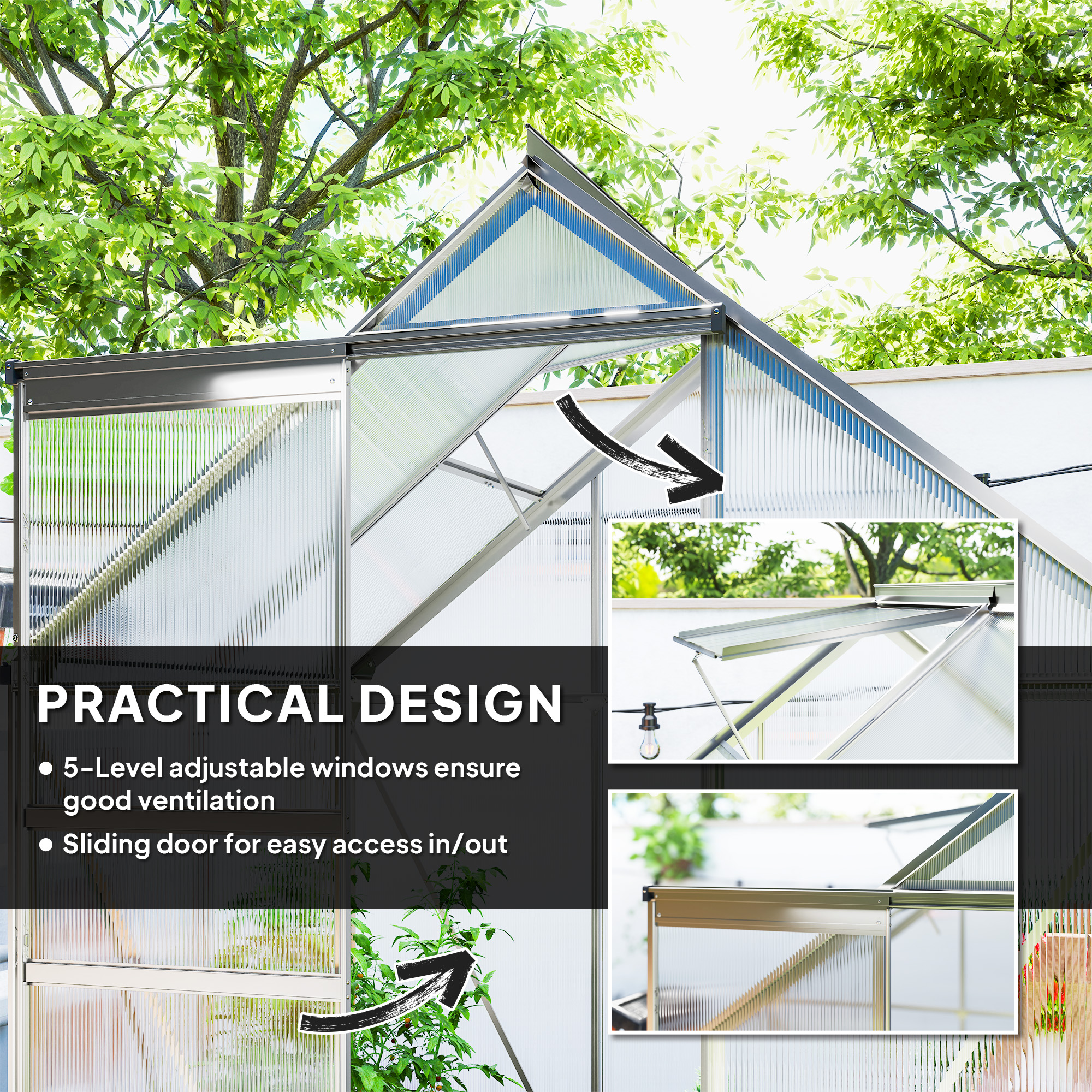 This Outsunny polycarbonate greenhouse is a piece for every gardener. The aluminium frame means a strong core, fitted with polycarbonate panels for a protective shell - protects plants from harsh sunlight, wind and rain. The transparent finish allows natural sunlight to promote healthy growth. Fitted with a sliding door for easy access, plus a five-level window to bring in plenty of fresh air whenever needed.