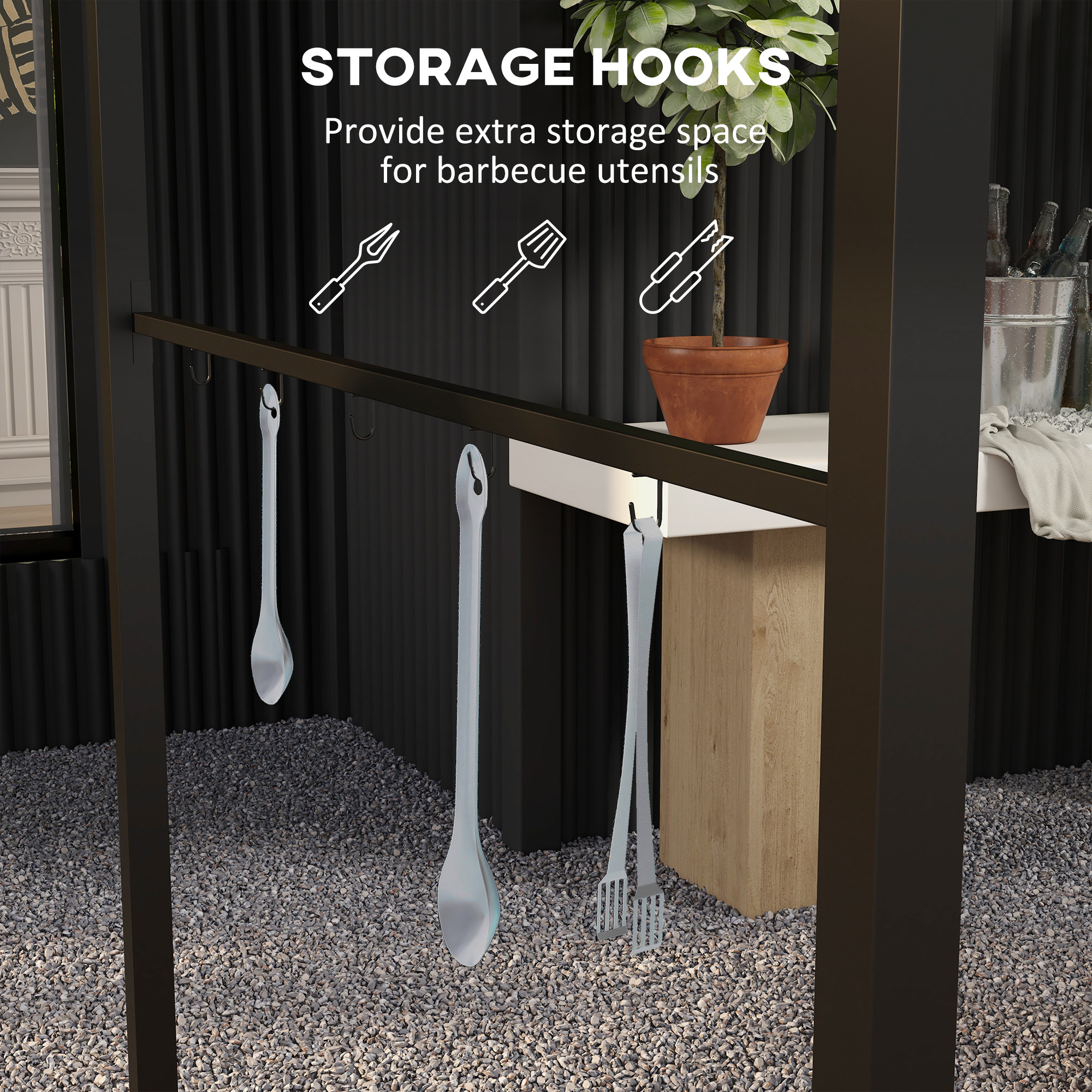 Protective BBQ grilling all summer long with this Outsunny smoking shelter. The 215cm x 150cm metal frame gives you plenty of room to work; top canopy of bbq hut creates a safe shelter inside from rain above. Five hooks on each side provide handy holding space for utensils. The curved roof helps to prevent too much smoke build-up inside. Set comes with ground pegs to pin to the ground.