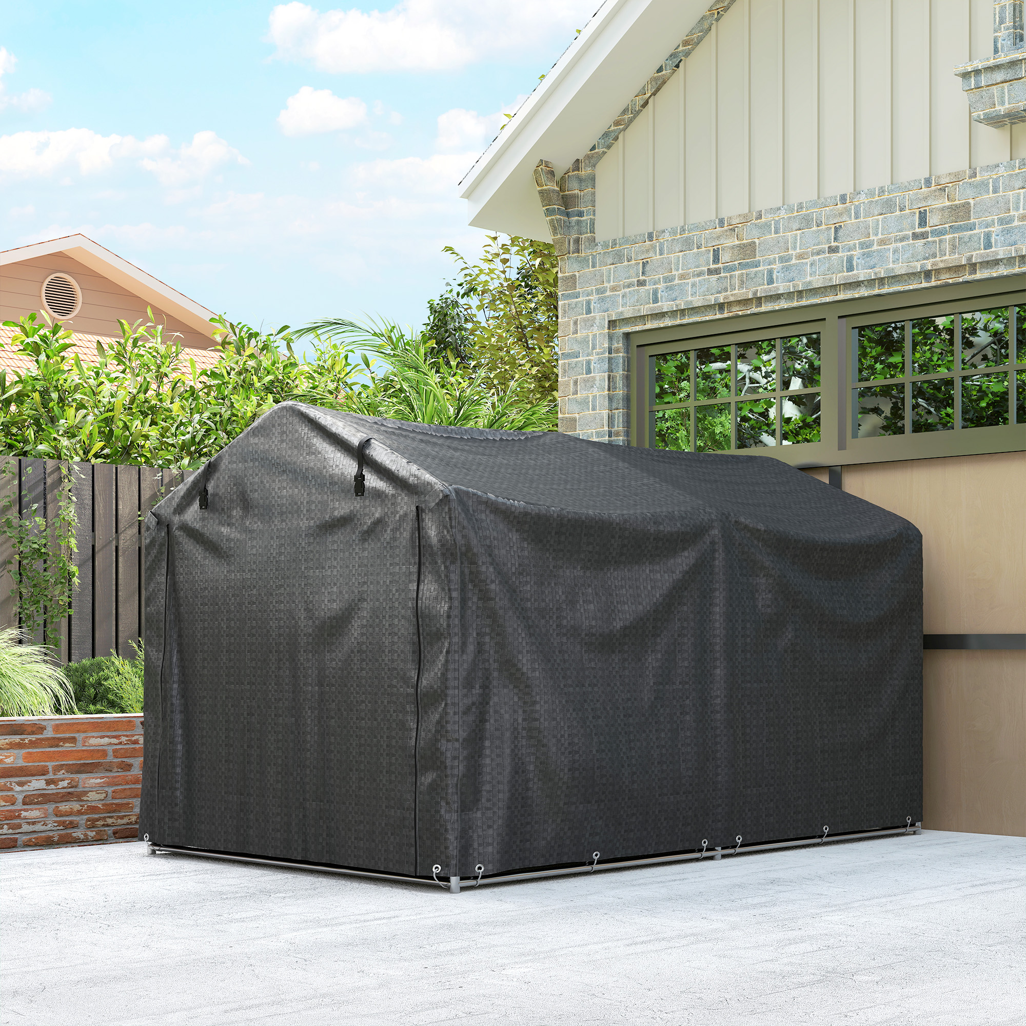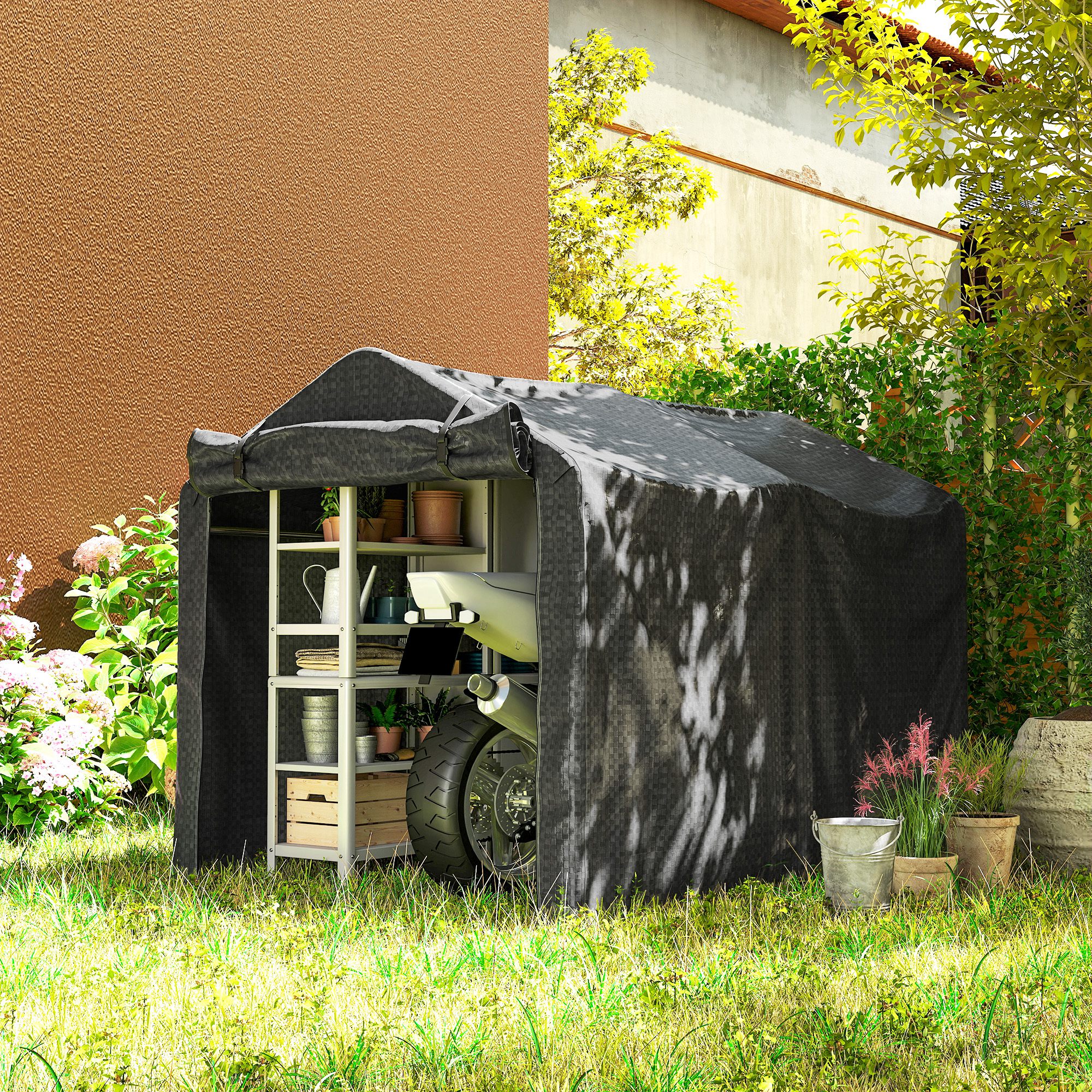 Discover the Outsunny garden shed, your spacious solution for stashing everything from bikes to pool gear. Crafted with UV-resistant PE cloth and a robust galvanised metal frame, this motorbike shed keeps your items protected come rain or shine. Plus, its roll-up zipped door enhances air flow and makes access a breeze! Great for anyone seeking a versatile outdoor shed.