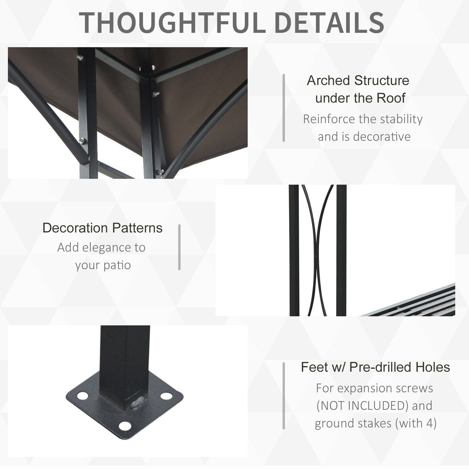 - Reinforced top and 8 ground nails for securing gazebo