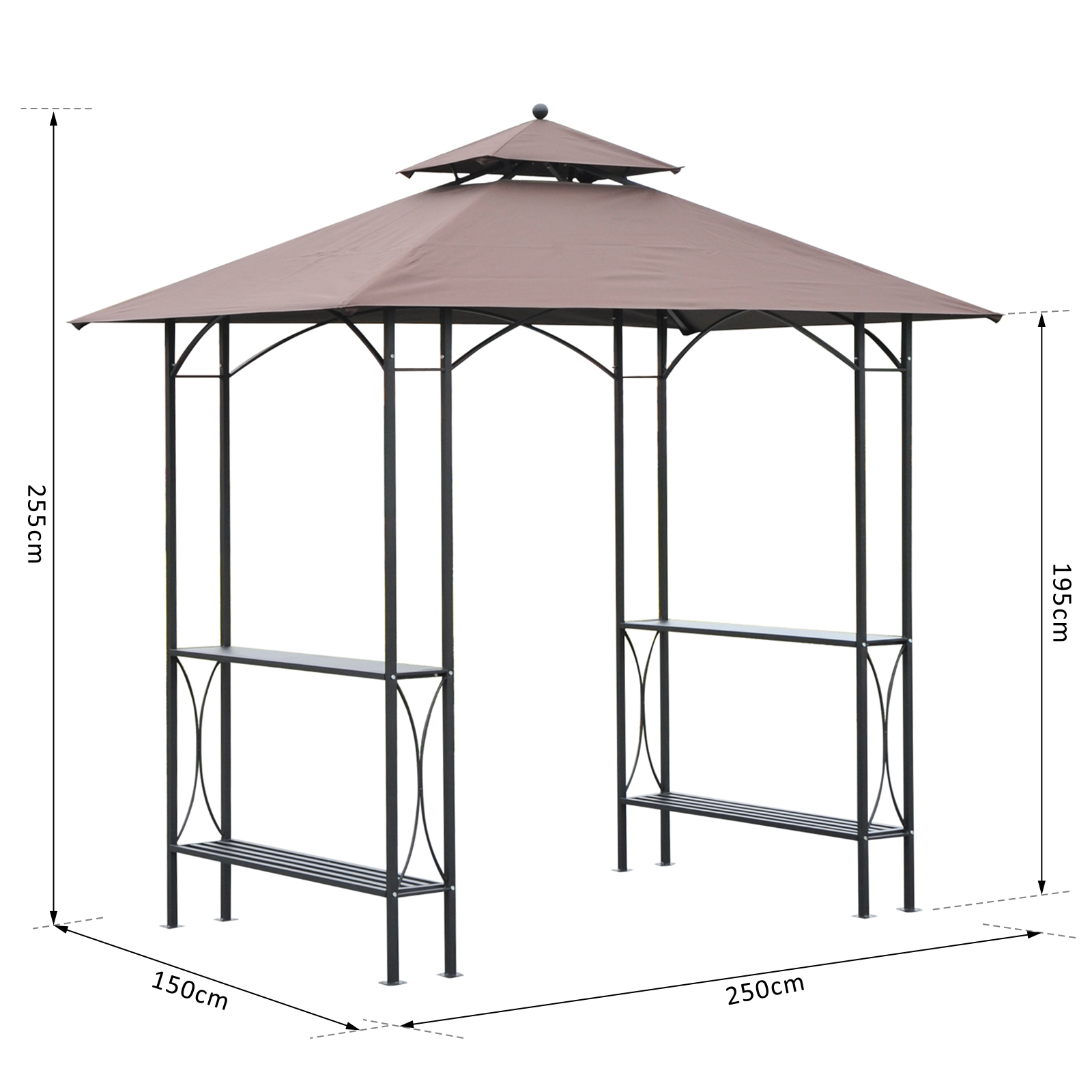 This Outsunny 8ft double tier BBQ canopy is a must in the summer season. It creates a cover above your BBQ area making it easy to cook and serve. It features a double canopy for air circulation and venting, it also has two side serving tables making it easier for family or guests. The gazebo is made from a metal structure with the top cover made from flame resistant polyester. This is a great item to have to entertain family and friends and a great item to match your outdoor space.