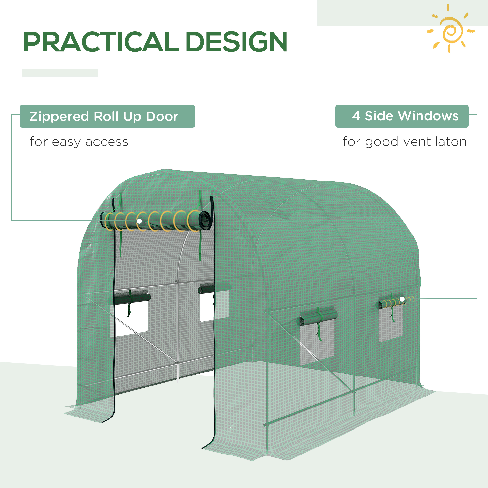 Put up and start growing a garden of greenery: look to this Outsunny 2.5 x 2m garden polytunnel greenhouse. A spacious and open inside design, there's plenty of room to grow a variety of vegetables, flowers and more; how about bringing in shelves too for easy organisation? A steel frame for a strong standing structure, with metal rods for extra support. Use the included guy ropes and ground stakes to pin structure to ground. Complete with mesh windows and large roll-up door.