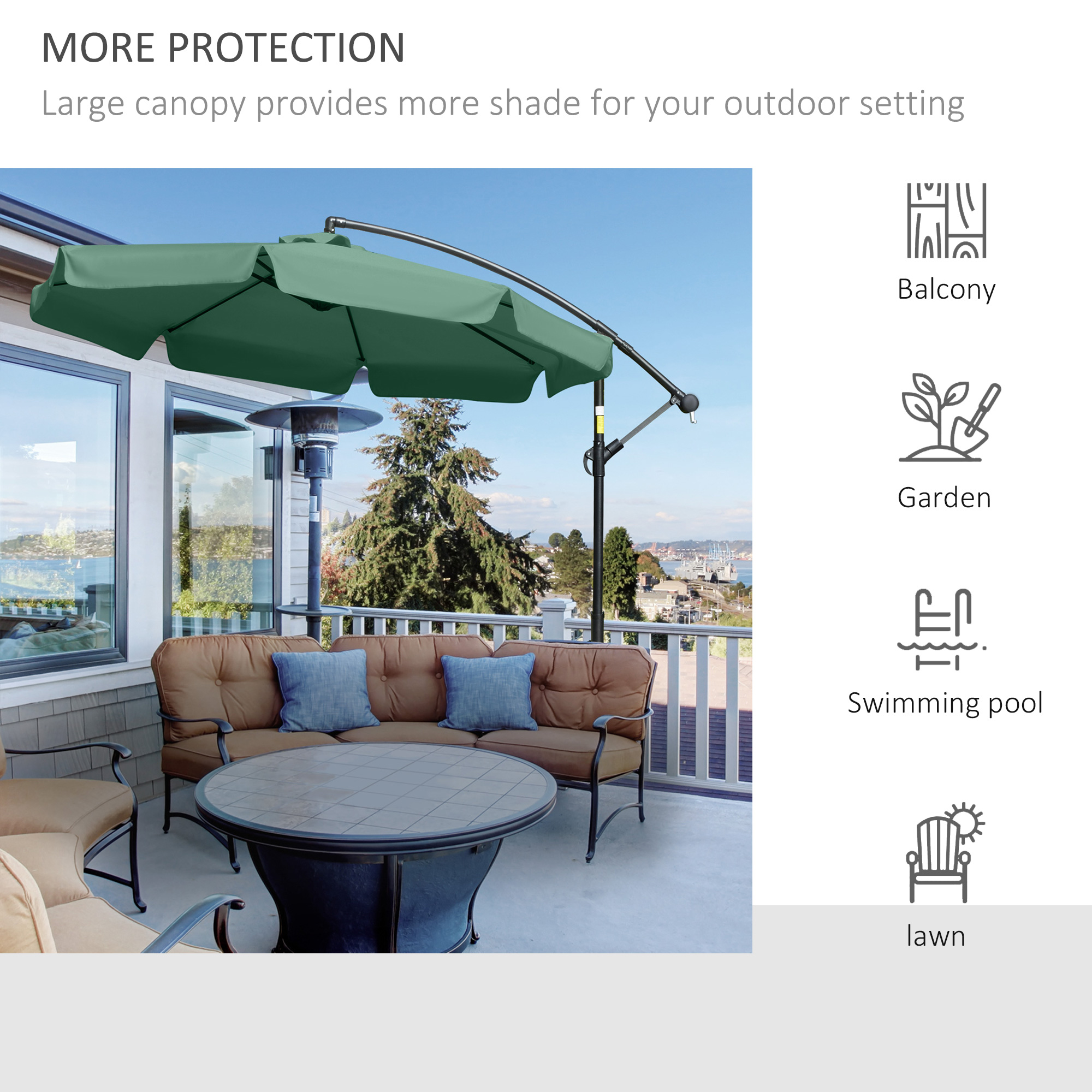 - Outdoor large overhanging parasol offers protective shade in outdoor settings