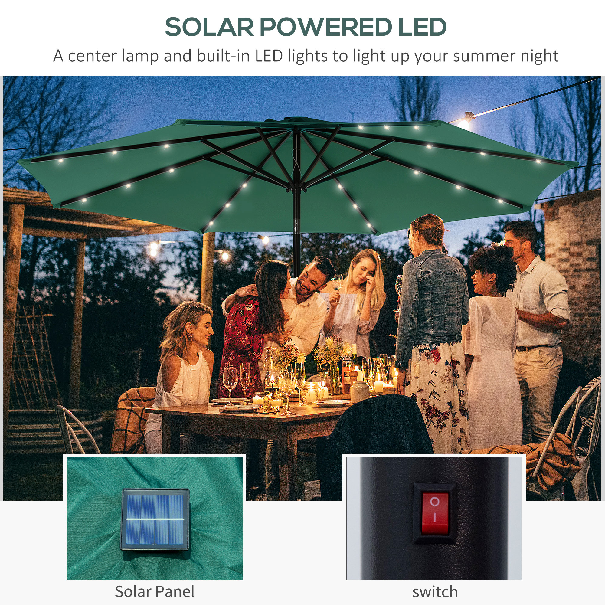 Sunny days are great, but sometimes you just need a little shade. Ensure you are covered on hot and sunny days with this garden parasol with lights from Outsunny. This parasol umbrella with lights can protect you from the UV rays and light up the night with its 24 solar-powered LED lights. High-grade polyester and a metal pole withstand natural elements and ensure years of reliable use. This Outsunny Solar Umbrella makes your garden more comfortable and inviting, even when night falls.