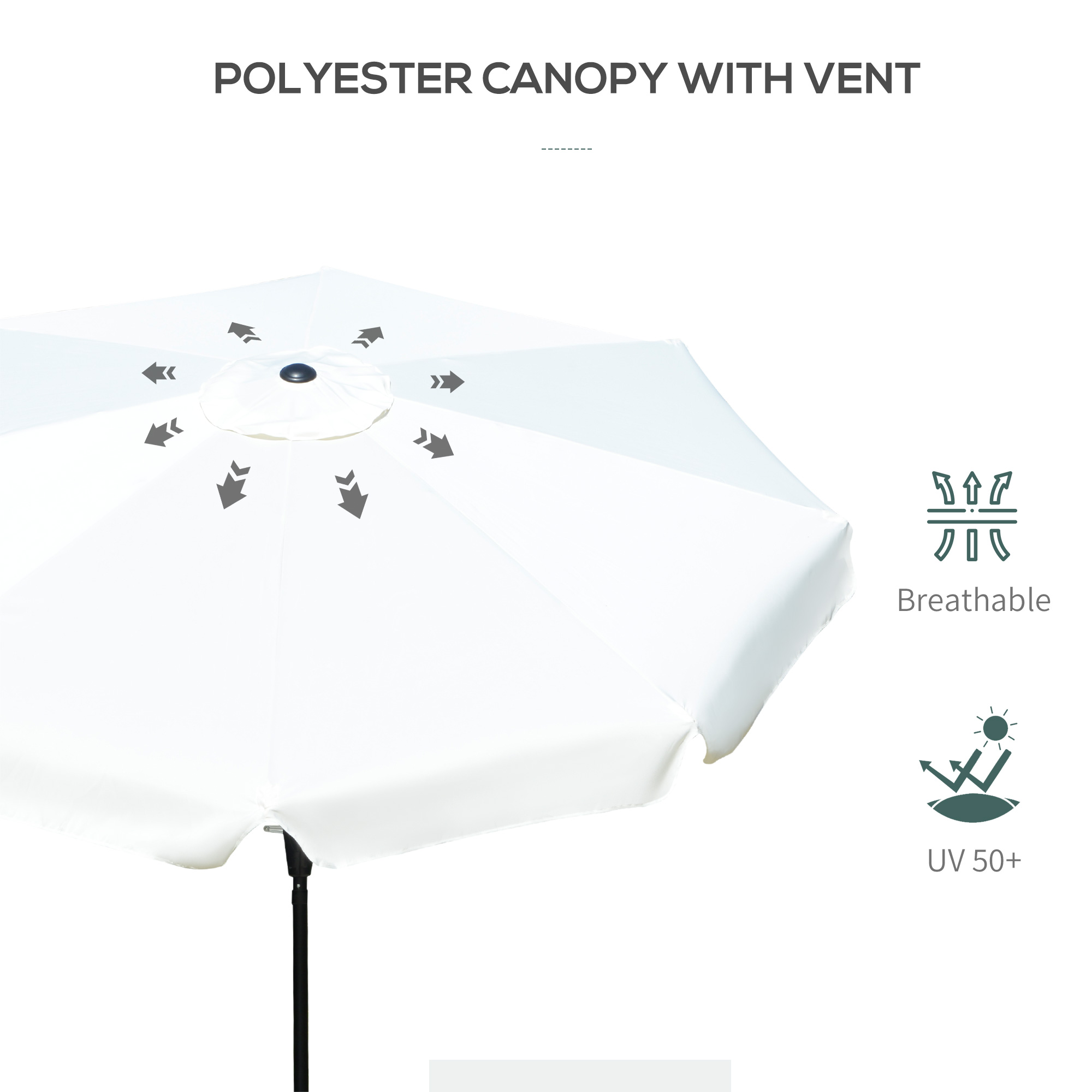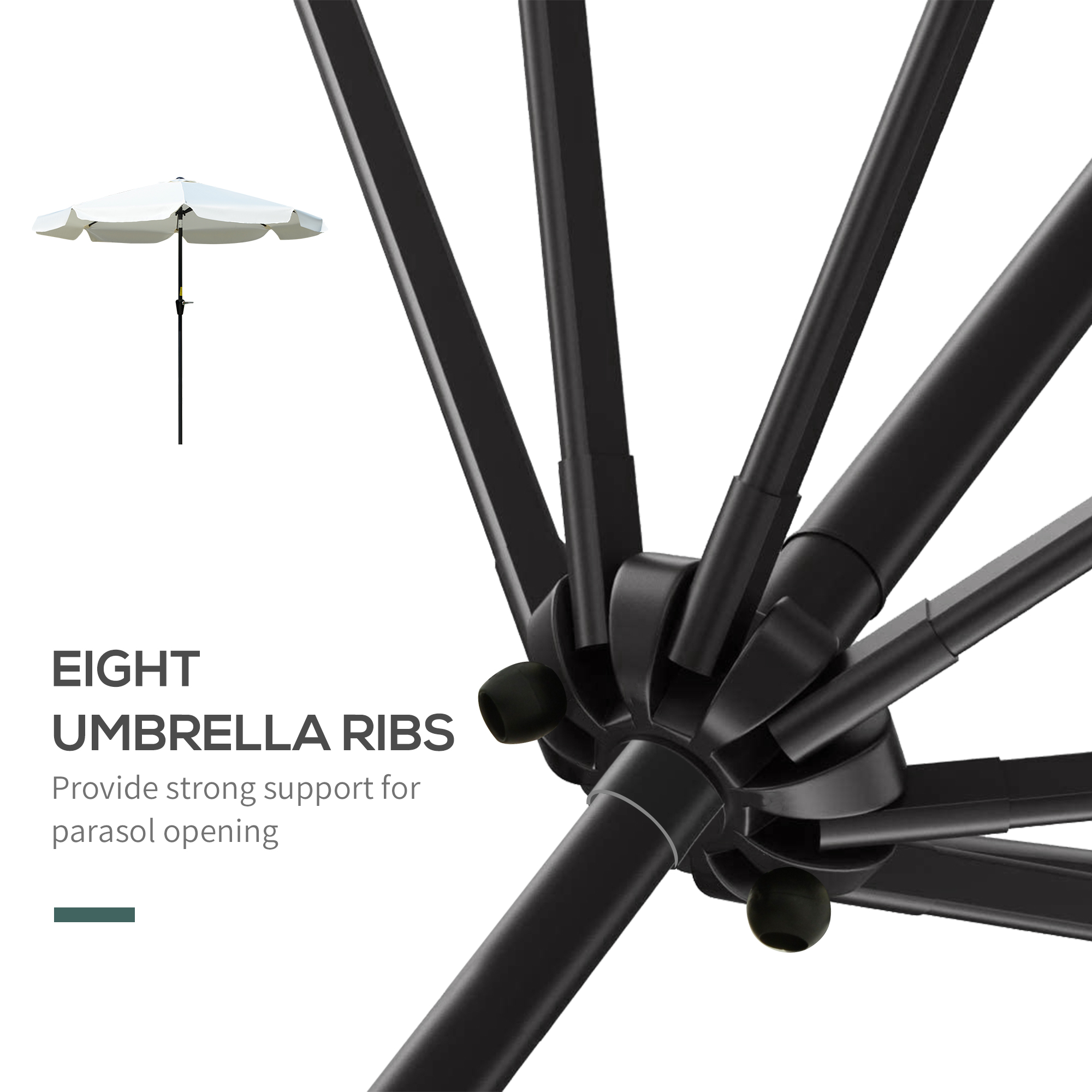 - Powder coated aluminium pole for a strong structure, with eight canopy ribs for extra support