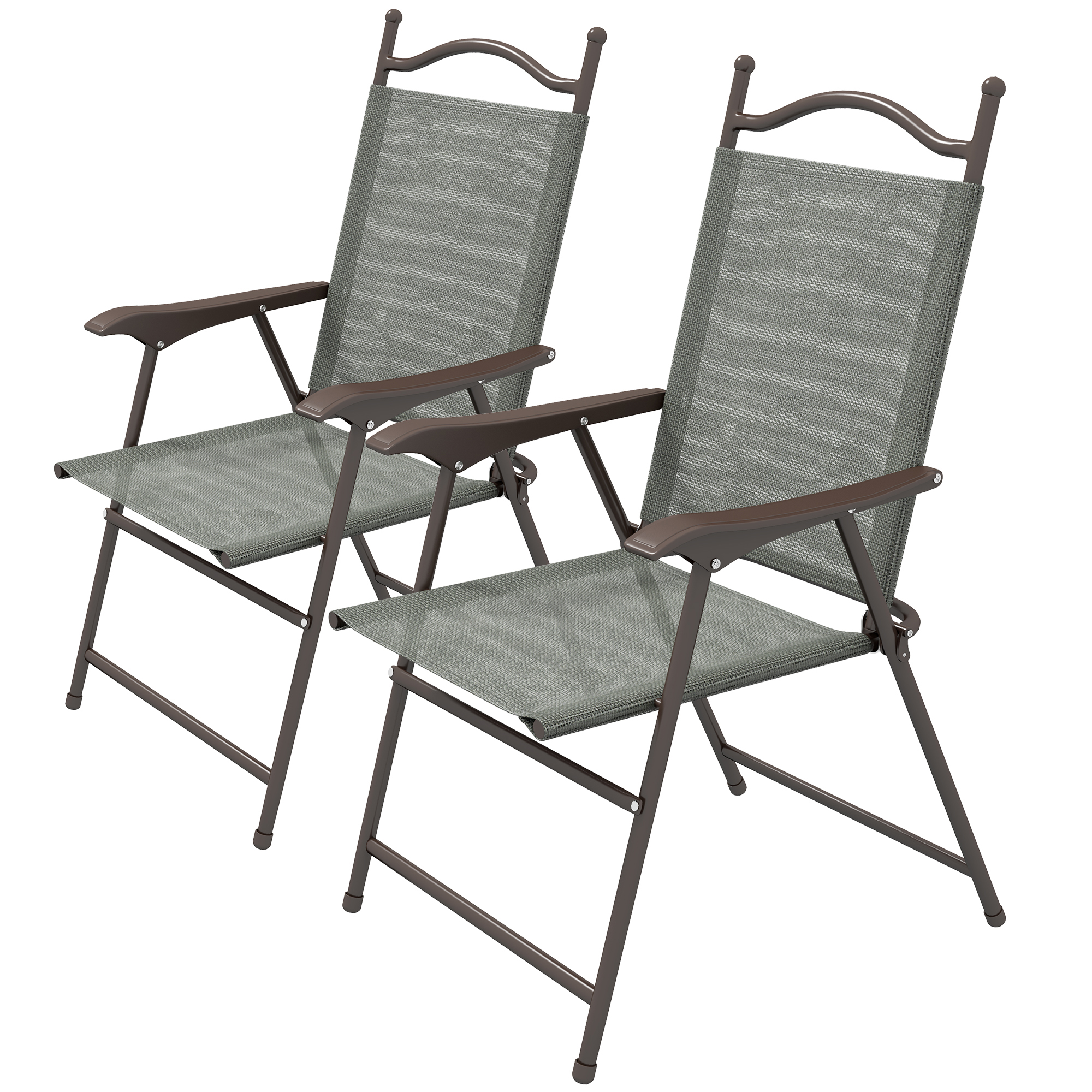 A comfortable seat for outside anywhere. These Outsunny folding chairs are portable designs, so you can take them to many places. Powder coated steel frames are strong and supportive. Tall back and armrests to support your body. Mesh fabric seats keep you comfortable. Two chairs per set.