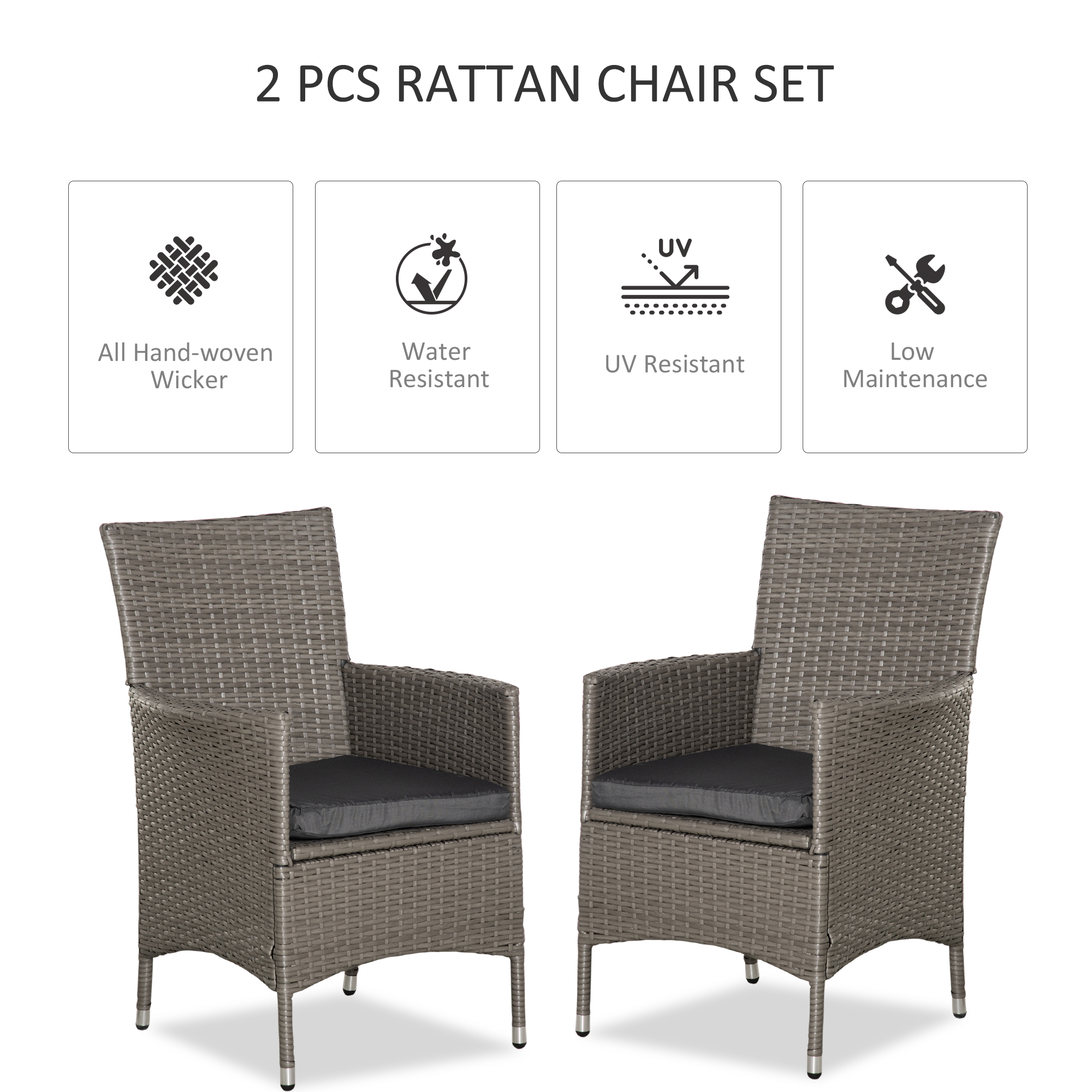 These two Outsunny rattan dining chairs are a great complement to your outdoors, whether standing alone or matched with other furniture. The garden dining chairs have a galvanised metal frame for a tough and fully supportive structure, wrapped in plastic rattan for durability and style. Tall backs and armrests for support, each chair has a cushion for comfort. Start the season the right way - start it with this stylish two-part set.