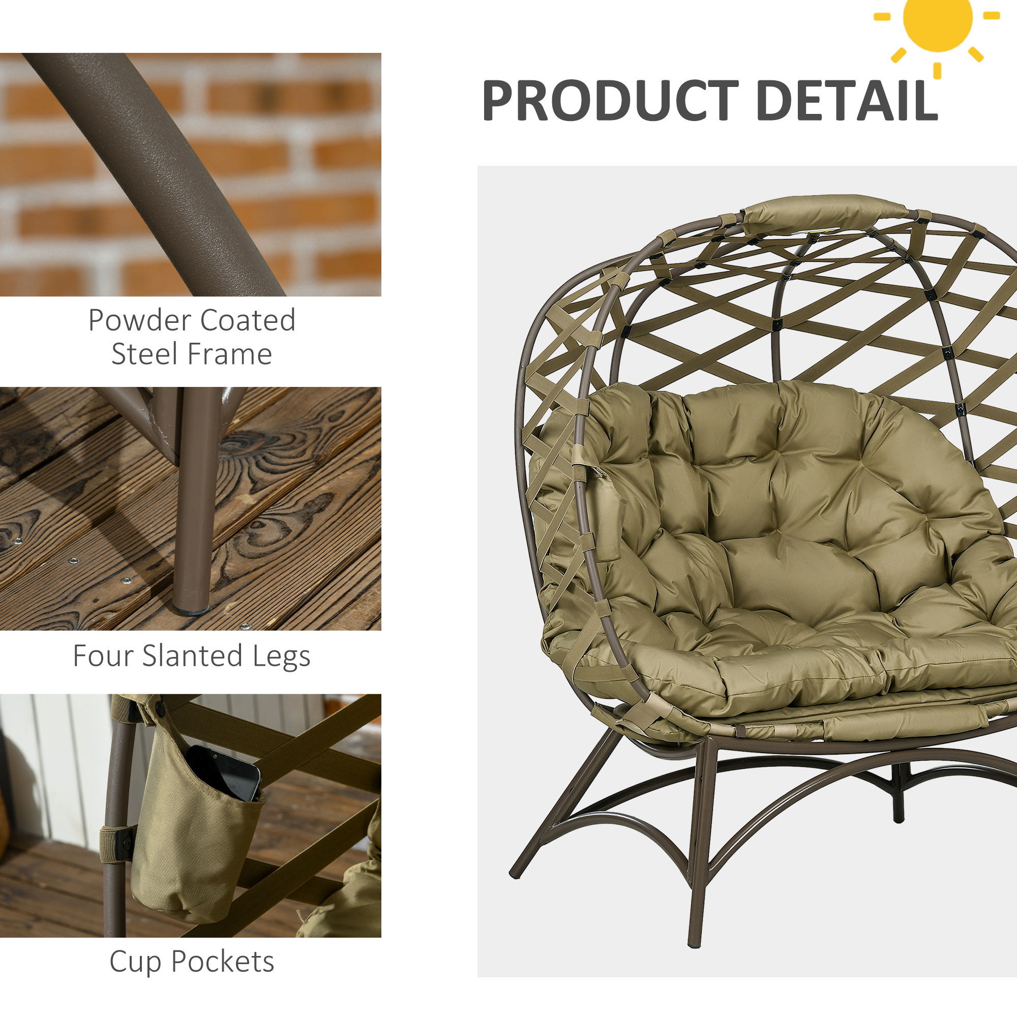 This Outsunny two-seater egg chair brings you and company together in comfort - and style. It comes in a large egg chair shape, fitted with a large padded cushion to keep you comfortable. A powder coated steel frame means a strong and supportive structure, with the cross weaves adding subtle style. Two side pockets offer handy storage for small items, right next to you.