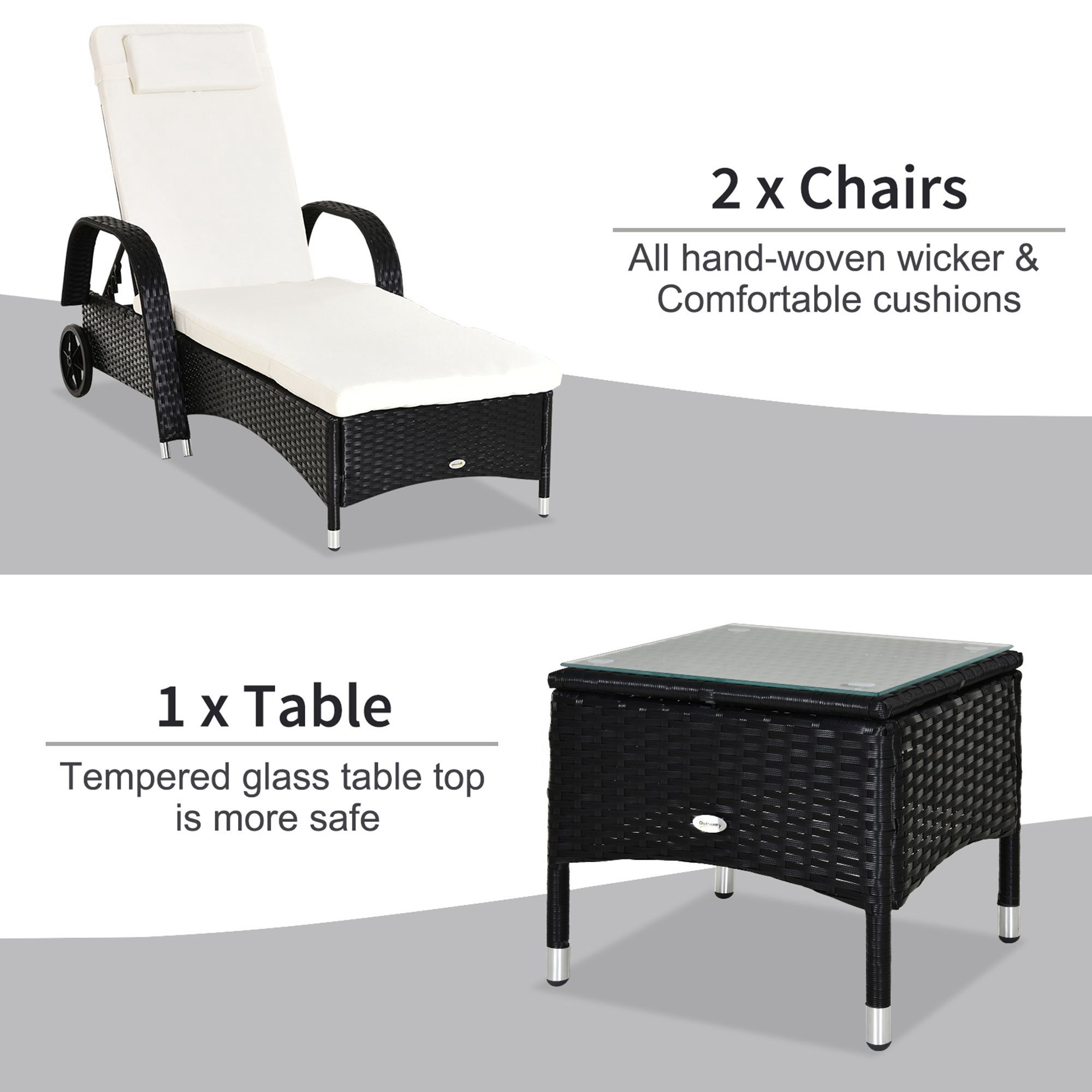The rattan patio chaise lounge set from Outsunny comes complete with 2 loungers, 1 side table and cushions. The seat has 5 adjustable positions to give maximum relaxation and comfort. The side table also has a glass top to keep your drinks at easy reach, and the set can be used indoors and outdoors.
