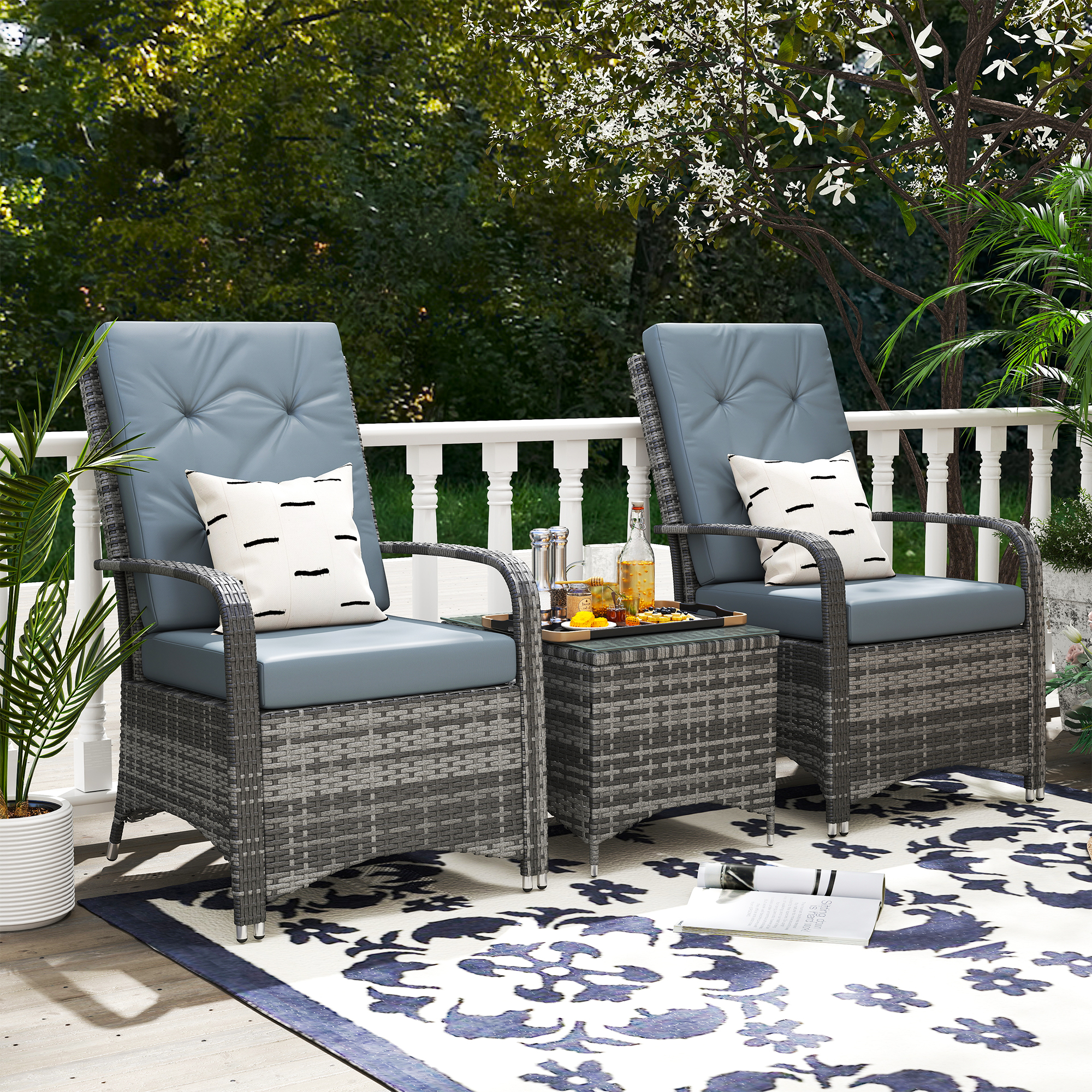 This outdoor bistro set made of PE Rattan is an ideal choice for your garden, patio or balcony. Combined with an steel frame structure and covered with rattan, this set is the optimal set to have. Comes with two seats with cushions and a table with a glass top to place drinks and magazines. The stylish modern design can fit into any style of your home and garden.\n