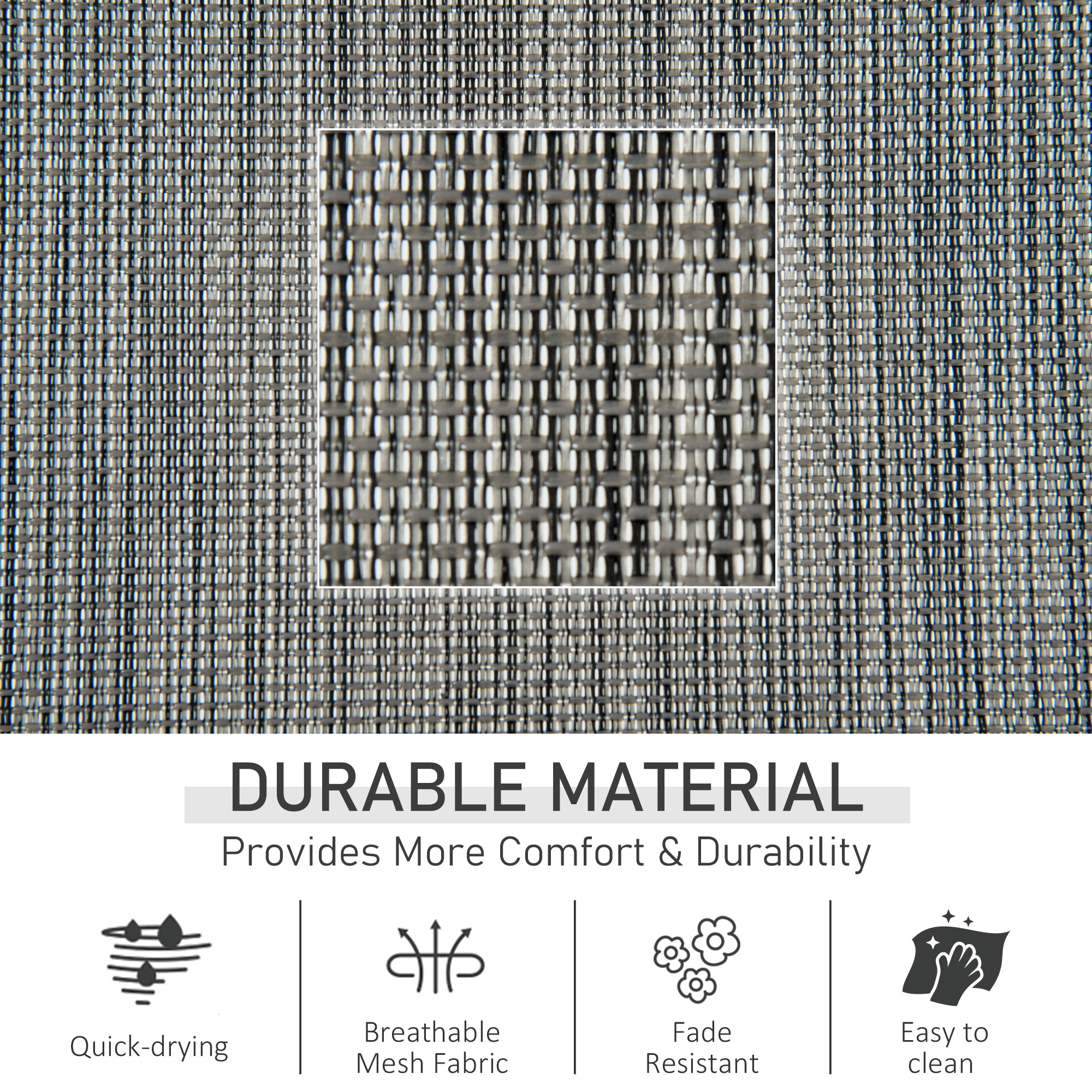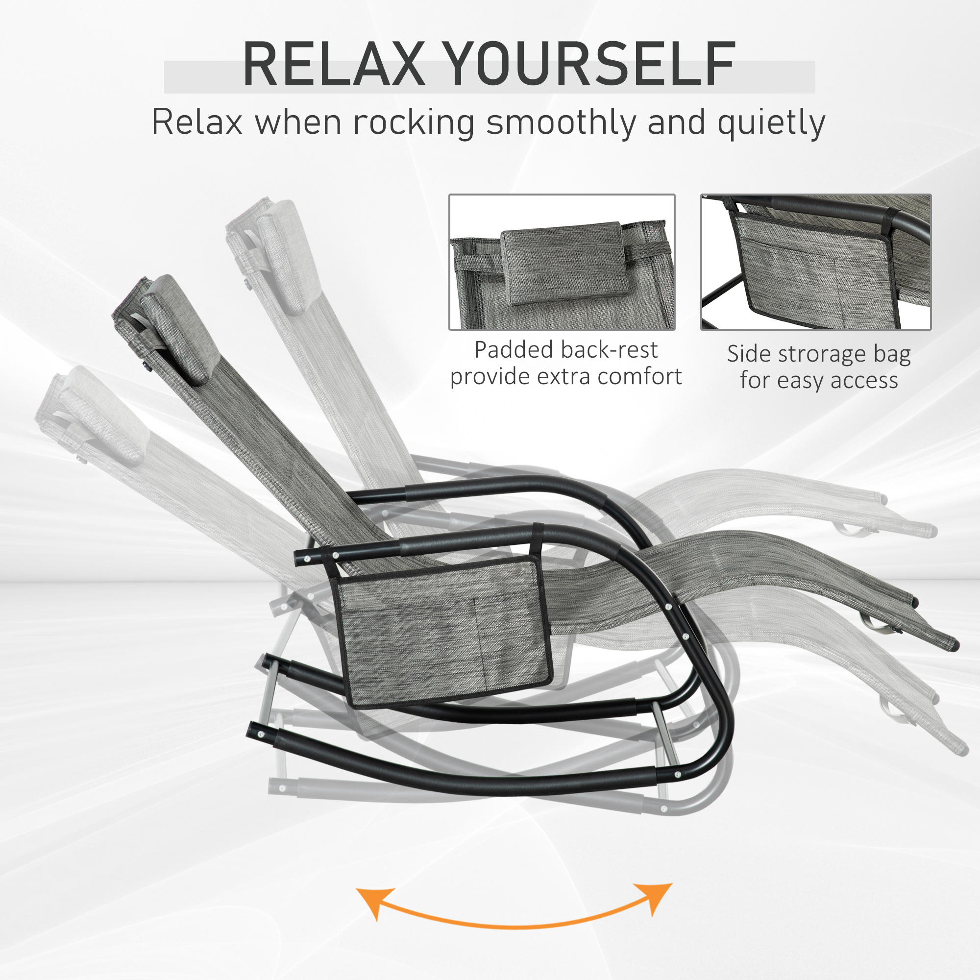 This outdoor rocking chair from Outsunny is a great way to relax outdoors. The curved frame has been made with your body comfort in mind, hugging to the contour of its shape. The seat is wrapped in mesh fabric which holds yours body in place, with a removable top pillow for head and neck comfort. Our patio rocking chair is finished with a removable side pocket, keeping everything you need next to you and rubber pads on the metal frame for protection.