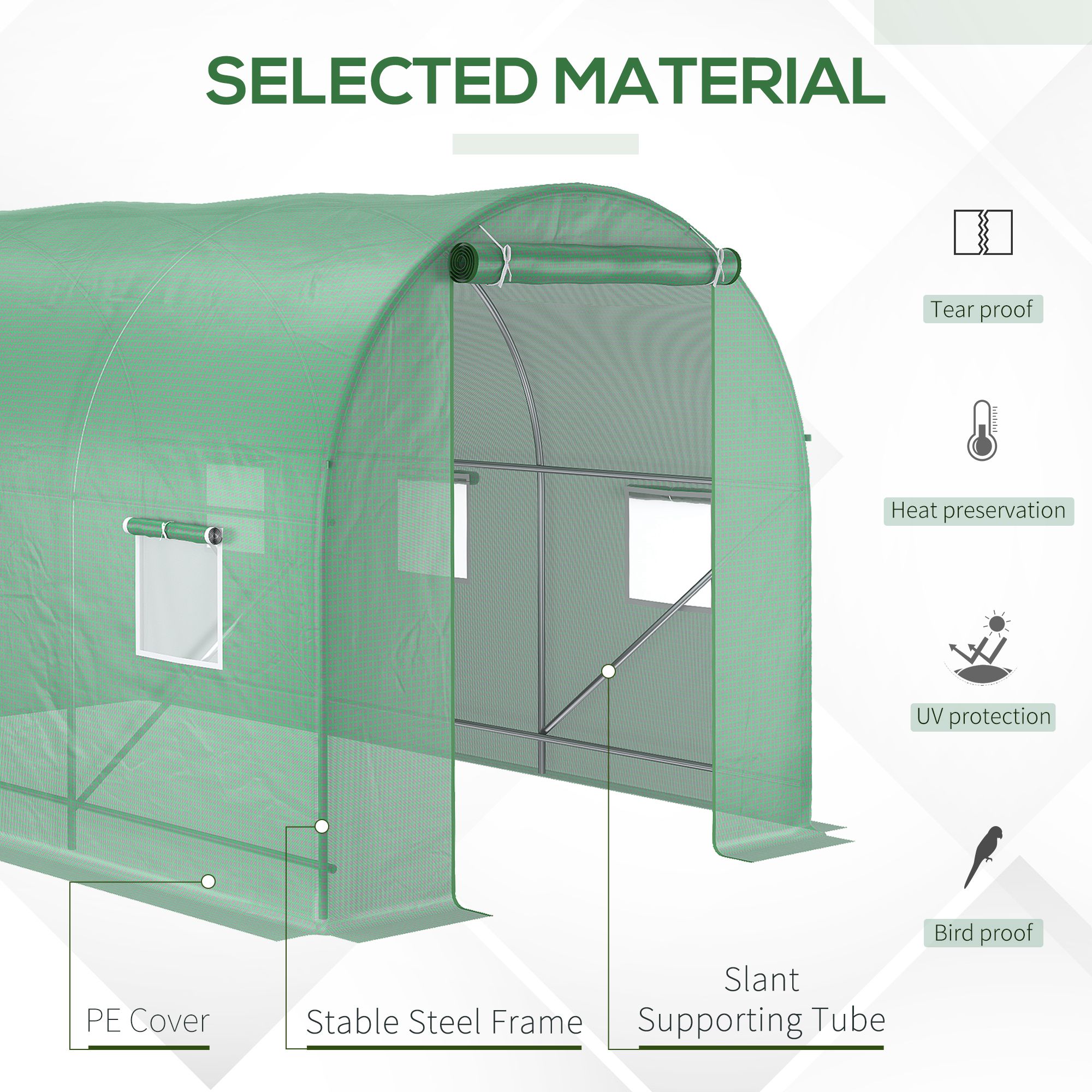 Put up and start growing a garden of greenery: look to this Outsunny 3.5 x 2m garden polytunnel greenhouse. A spacious and open inside design, there's plenty of room to grow a variety of vegetables, flowers and more; how about bringing in shelves too for easy organisation? A steel frame for a strong standing structure, with metal rods for extra support. Use the included guy ropes and ground stakes to pin structure to ground. Complete with mesh windows and large roll-up door.