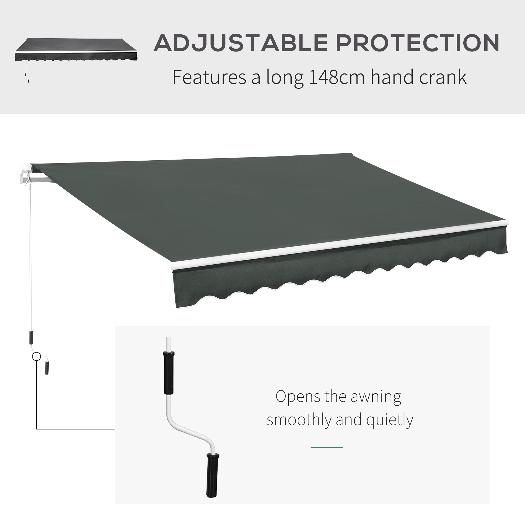 With a thick sun-shielding canopy fixed on an aluminium frame, this 3.5 x 2.5m awning from Outsunny will give you all the shade you need this season. The manual design means you can set it up wherever needed - whether it's above a door or window, and it easily mounts onto your chosen surface with all accessories included in the package. Finished with a crank handle for easy operation. It's time to enjoy the beauty of the Summer more than ever before.