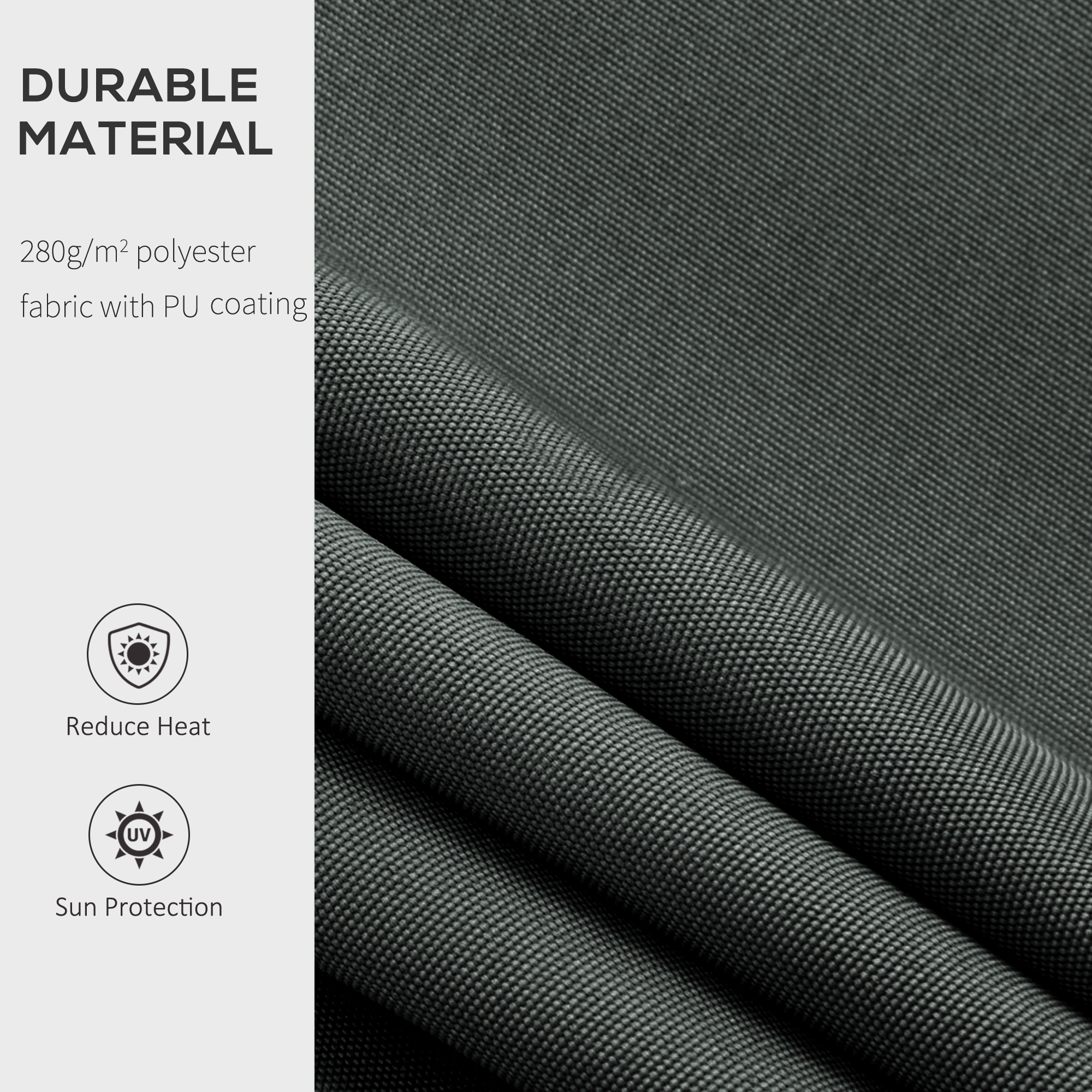 - Thick 280g/㎡ polyester canopy to keep underneath cool. Plastic coating for durability