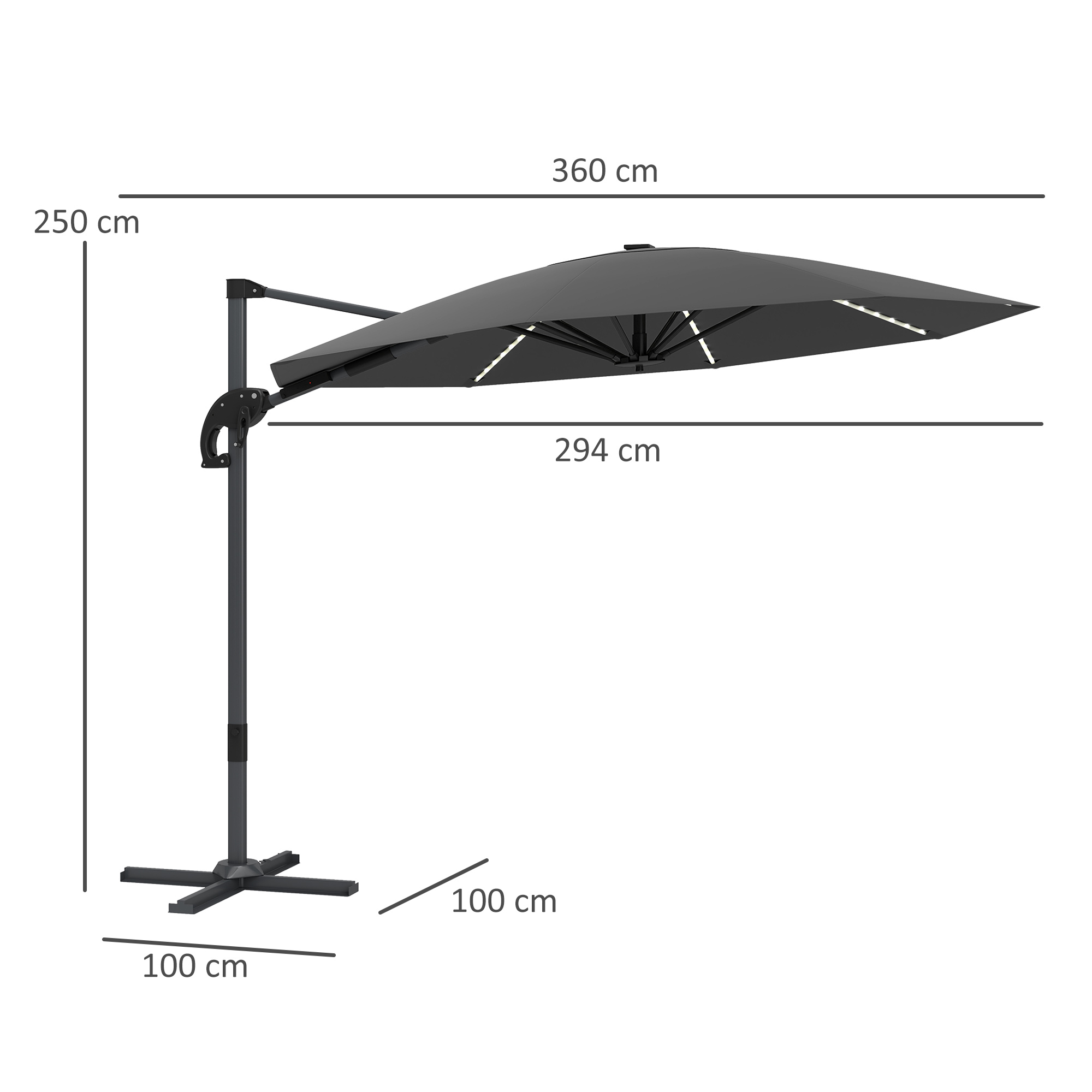 Enjoy expansive shade and a touch of evening magic with the Outsunny garden parasol with base included, featuring 360-degree rotation for optimal sun protection at any angle. With seven copper wire string lights, adjustable brightness, it transforms your garden into a romantic haven. Crafted with splash-resistant, UPF 50+ fabric and robust aluminium, this outdoor umbrella for garden is your great outdoor companion.