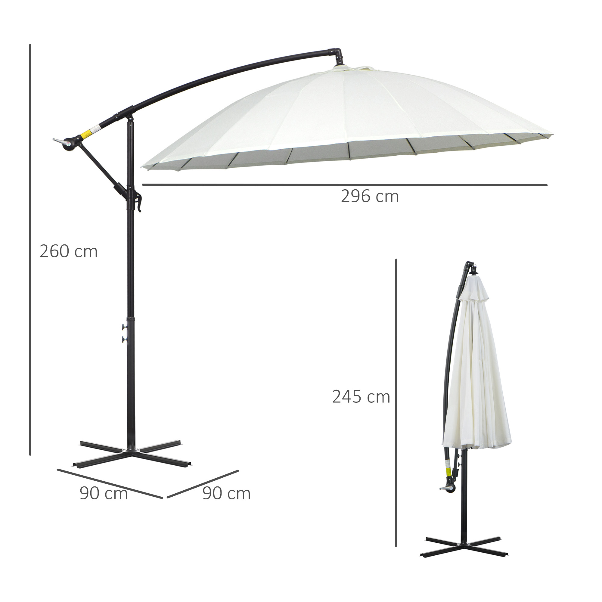 Enjoy the sun the safe way - keep yourself protected with this parasol umbrella from Outsunny. The overhanging design means it's can be positioned on the edge of tables to give you shade, without the central pole blocking your view at the table. The large polyester canopy provides plenty of shade and reduces the risk of direct UV damage and sunstroke. The canopy is connected to the tough metal frame with 18 fibreglass ribs for extra strength and stability. It's finished with a hand crank, which opens and closes the canopy smoothly and easily - so everyone can use it. Please note, only a cross base included, no counterweight base. For a compatible base, search the following Outsunny skus: 84D-070, 84D-128, 84D-048 and 84D-124.
