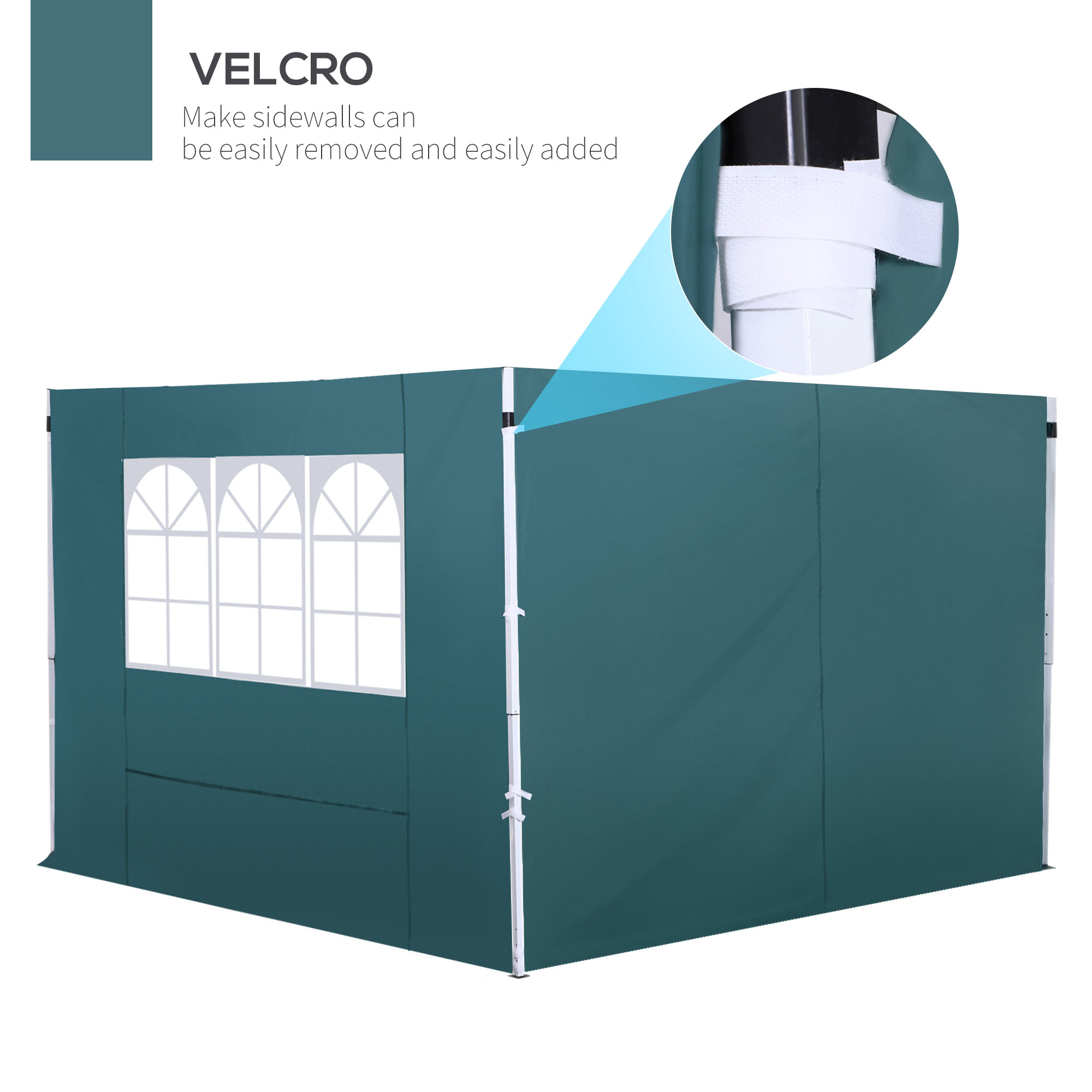 Gazebo replaceable side walls, which can be easily removed and added with Velcro attachments. The gazebo side curtains fits for gazebo or party tent, creating a sheltered wall for your instant gazebo. Made with UV proof material, the event shelter sides protects you from harmful UV rays and adds protection and privacy. Easy to attach to the canopy. It' s great for camping excursion, outdoor party.