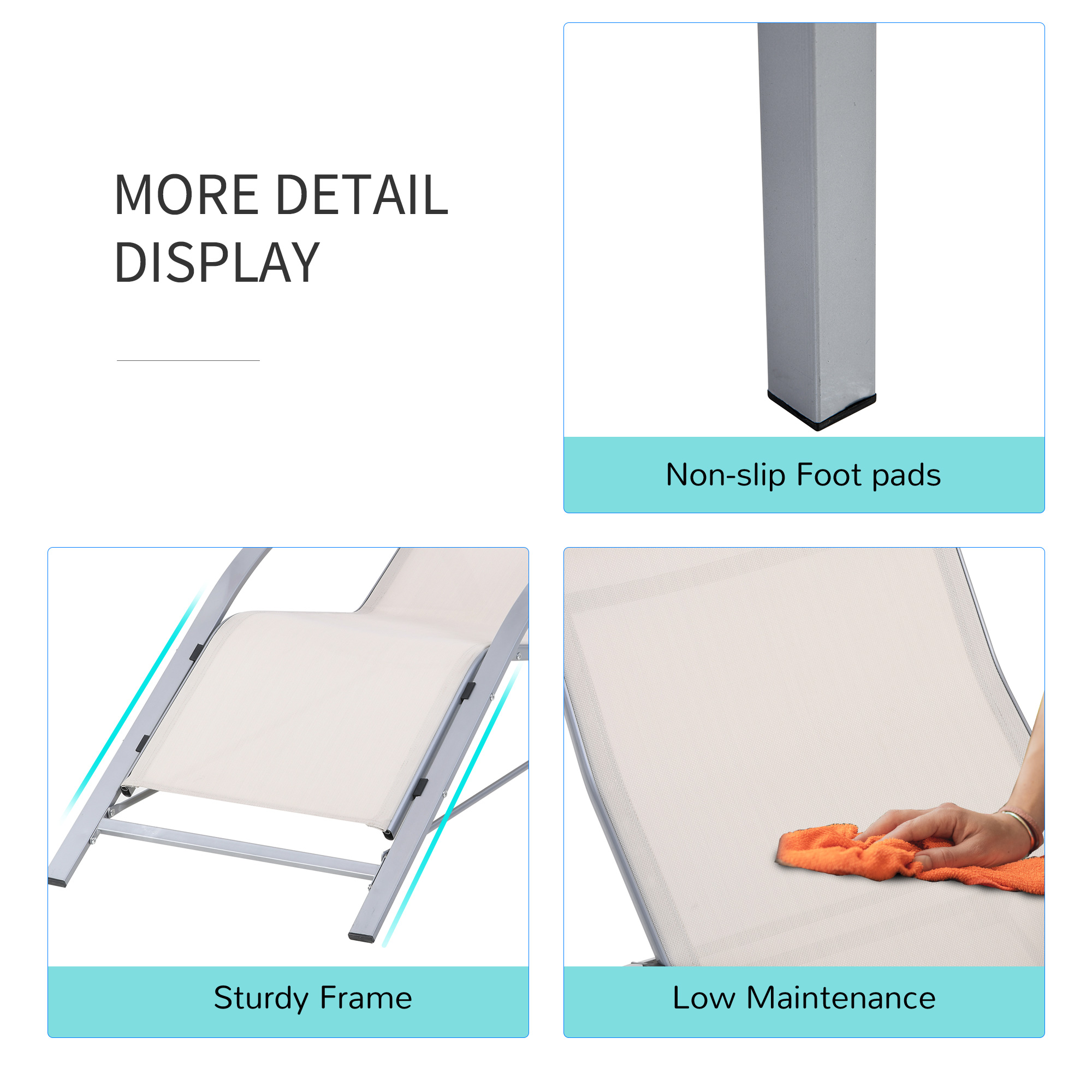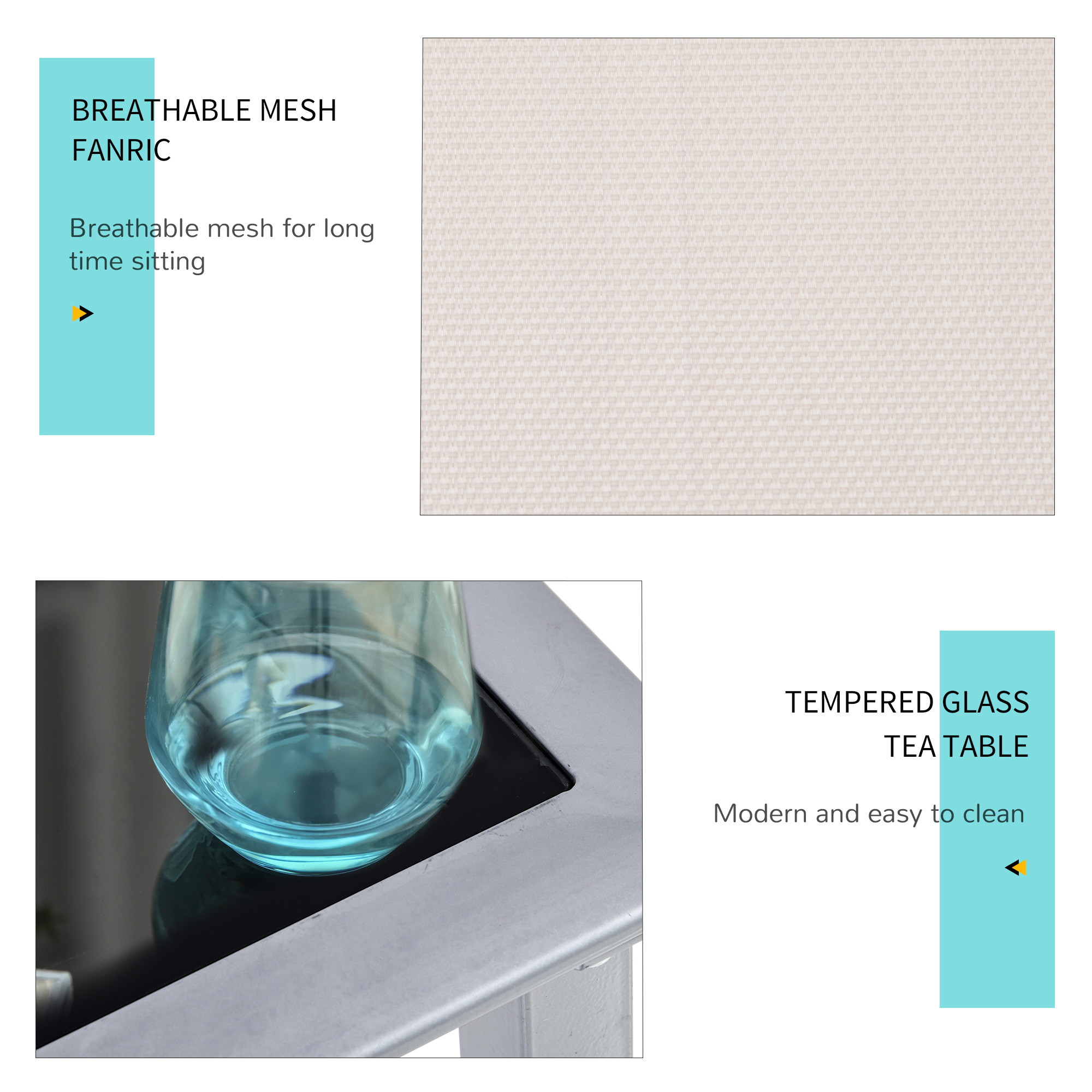 Refresh your outdoor space with the garden recliner chairs set of 3 Outsunny. Using metal for the frame of both chairs and a table, the structure is tough and durable, so it can be used every day. The sun loungers for garden are wrapped in breathable mesh for comfort and smoothness on the skin. The table comes with a thick glass top for a safe and secure holding place. Stylish and functional, this set is perfect for patios, gardens, balconies and any other outdoor space. Assembly is required.