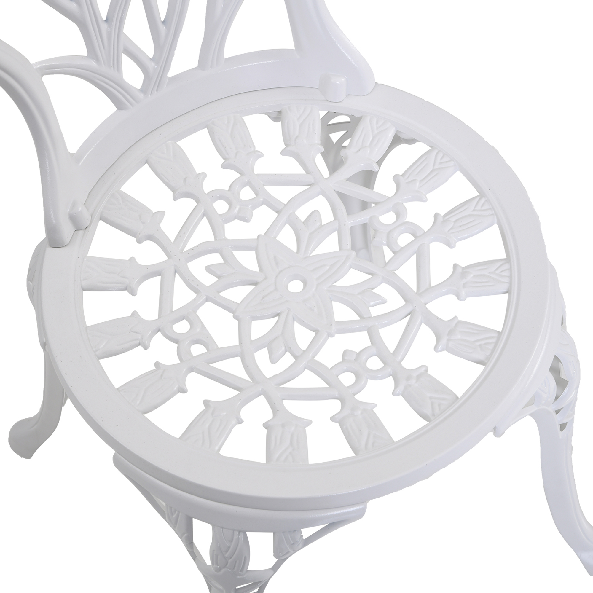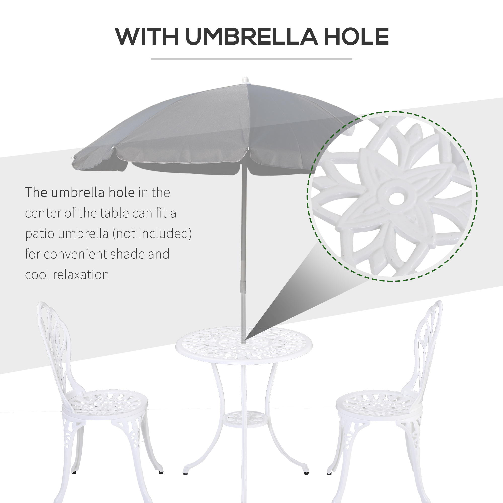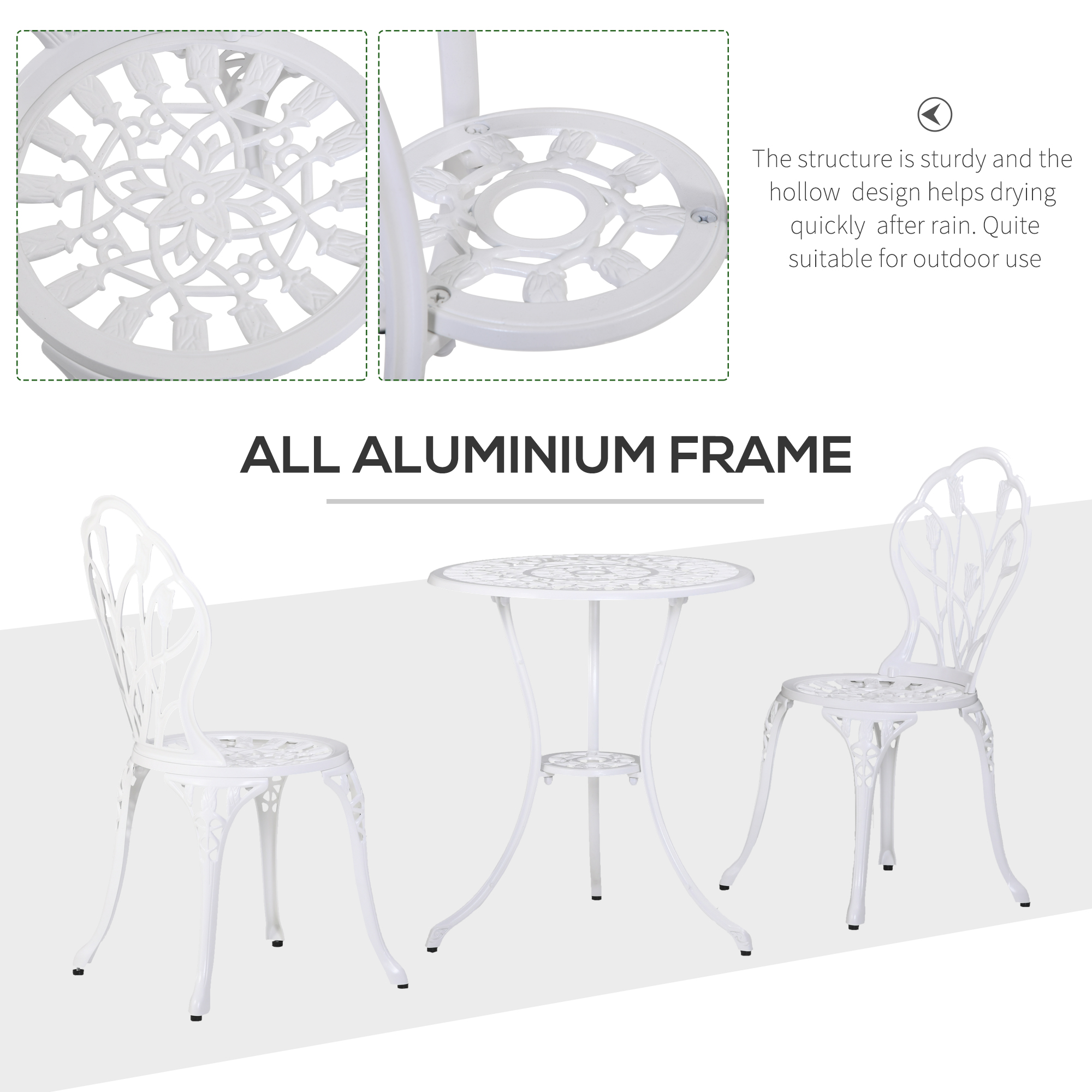 Enjoy outdoor times with some vintage charm, with this Outsunny three-piece bistro set. The hollow-carved tulips design is beautiful. Made from cast aluminium for long-term use. The table of this garden set features an umbrella hole, so you can all keep shaded from a parasol safely when it's sunny.