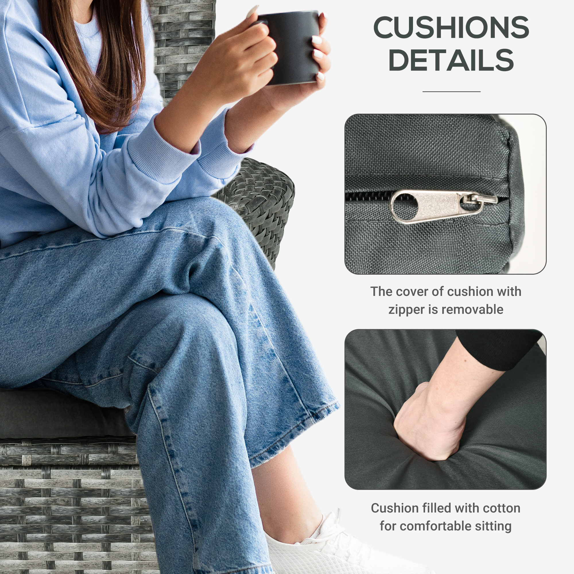- Padded cushions for comfort. Removable and washable covers