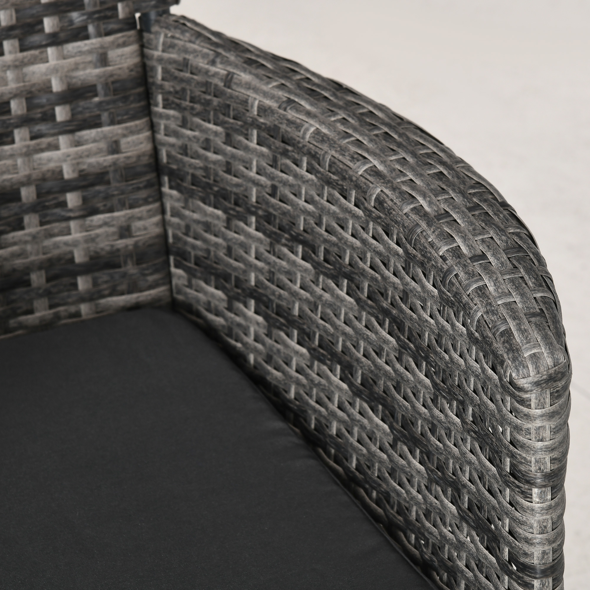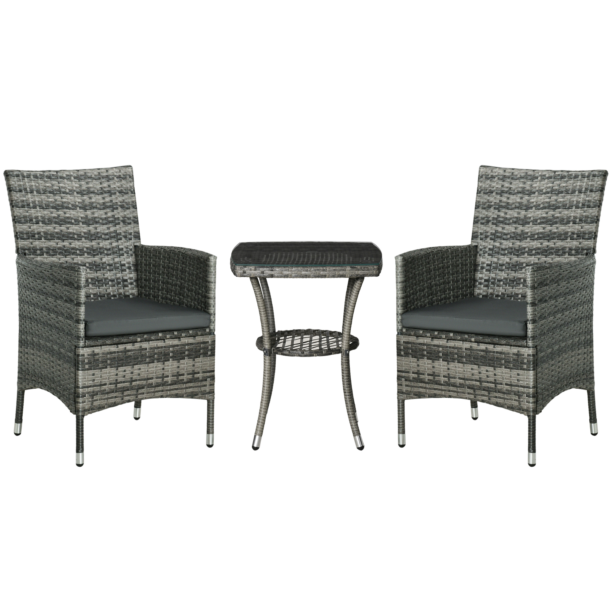This Outsunny outdoor bistro set is great for any patio, garden, porch and similar spaces. Frames of the rattan bistro set is made from powder coated steel mean a strong structure, wrapped in plastic PE rattan wicker for garden rattan style. UV and water resistant. Matching table gives a handy side surface, with a safe and sleek glass top. Repeat and use, season after season.