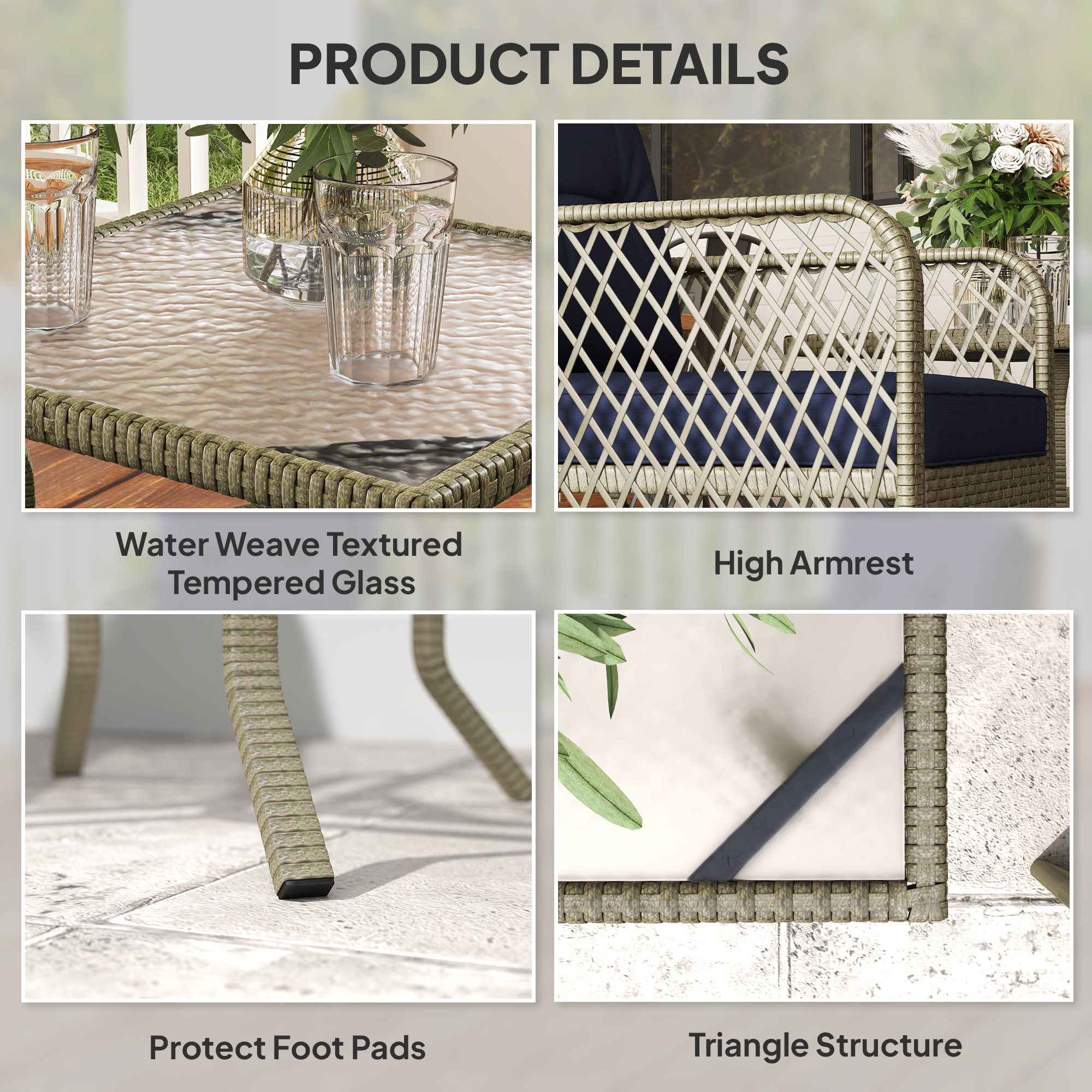 - Material: Metal, PE Rattan, Polyester, Vertical Cotton, Tempered Glass