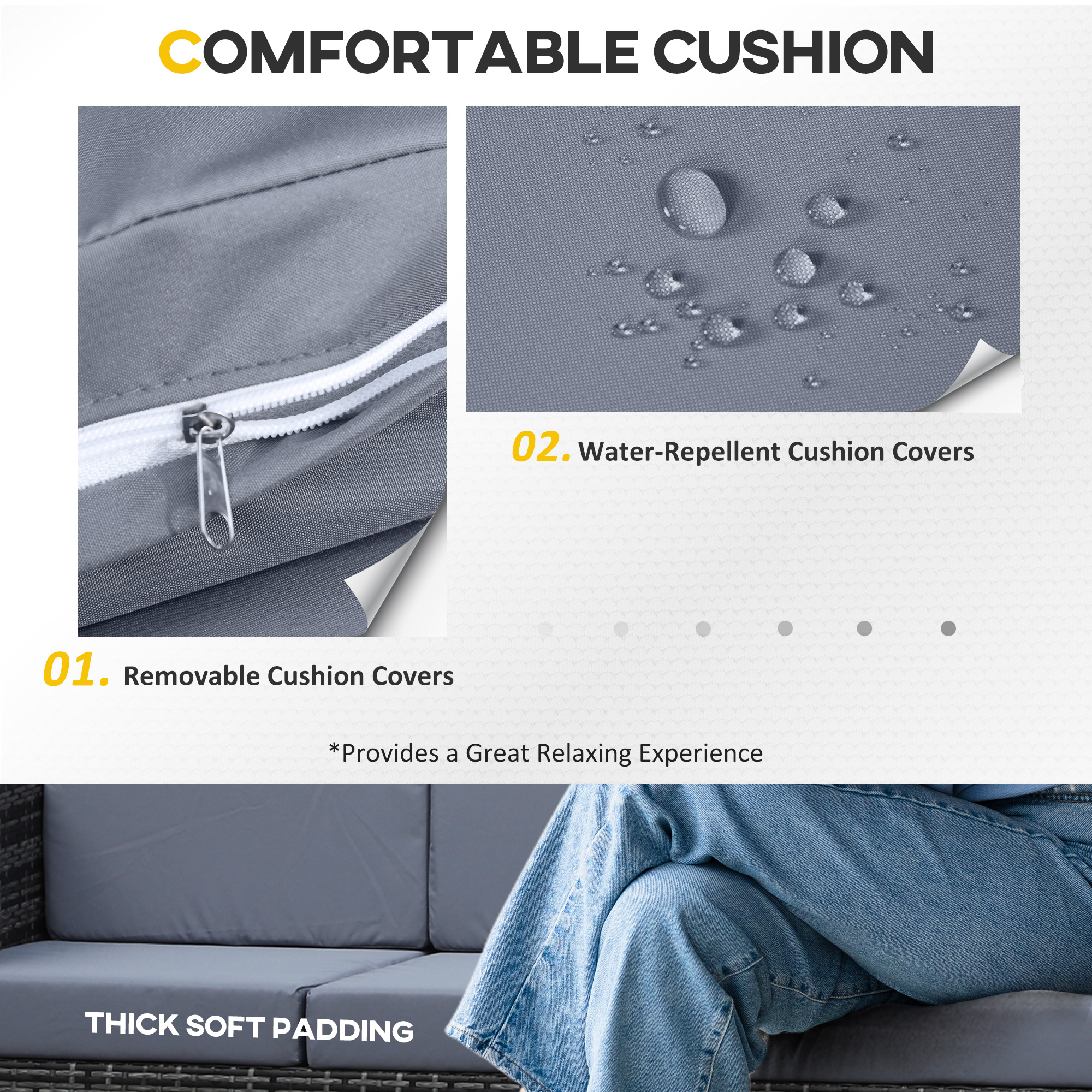 - Thick seat and back cushions allow you to sit in comfort, with washable and water-resistant cushions