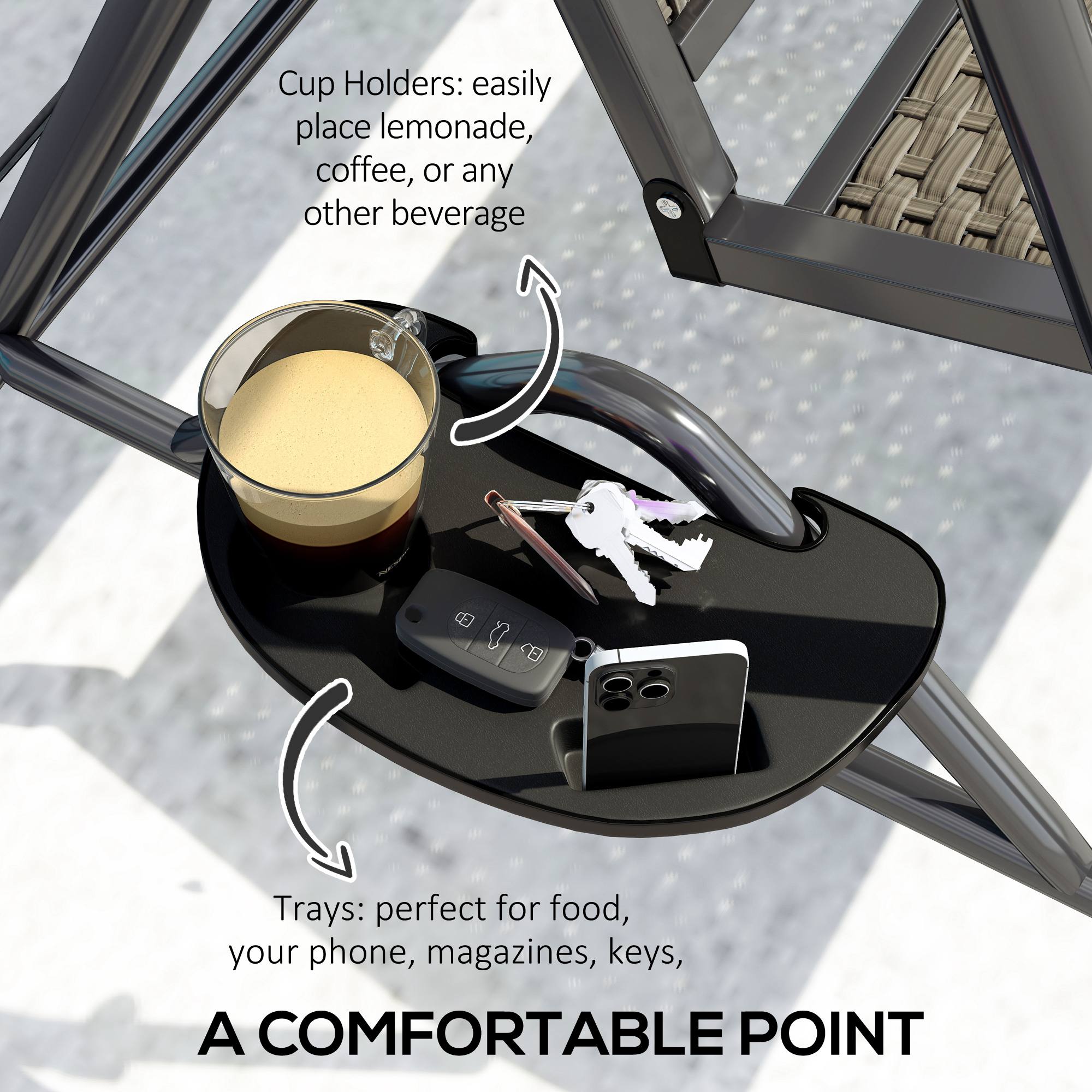 - Includes cup holders, and tray space