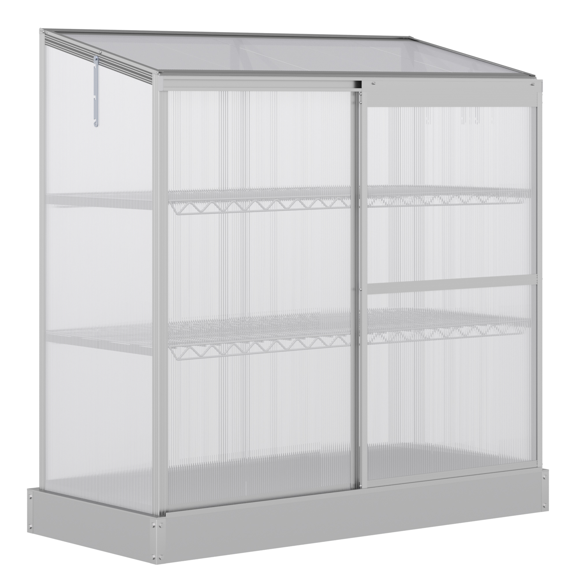 Give your plants and vegetables somewhere to enjoy the sunshine and grow heartily, thanks to this Aluminium Greenhouse from Outsunny. Small aluminium cold frame provides strength, with the polycarbonate panels protecting the inside from medium wind and rain, whilst allowing the sunlight to pass through. Inside two shelves are placed for organisation, with a lift-up lid and sliding door for easy access.